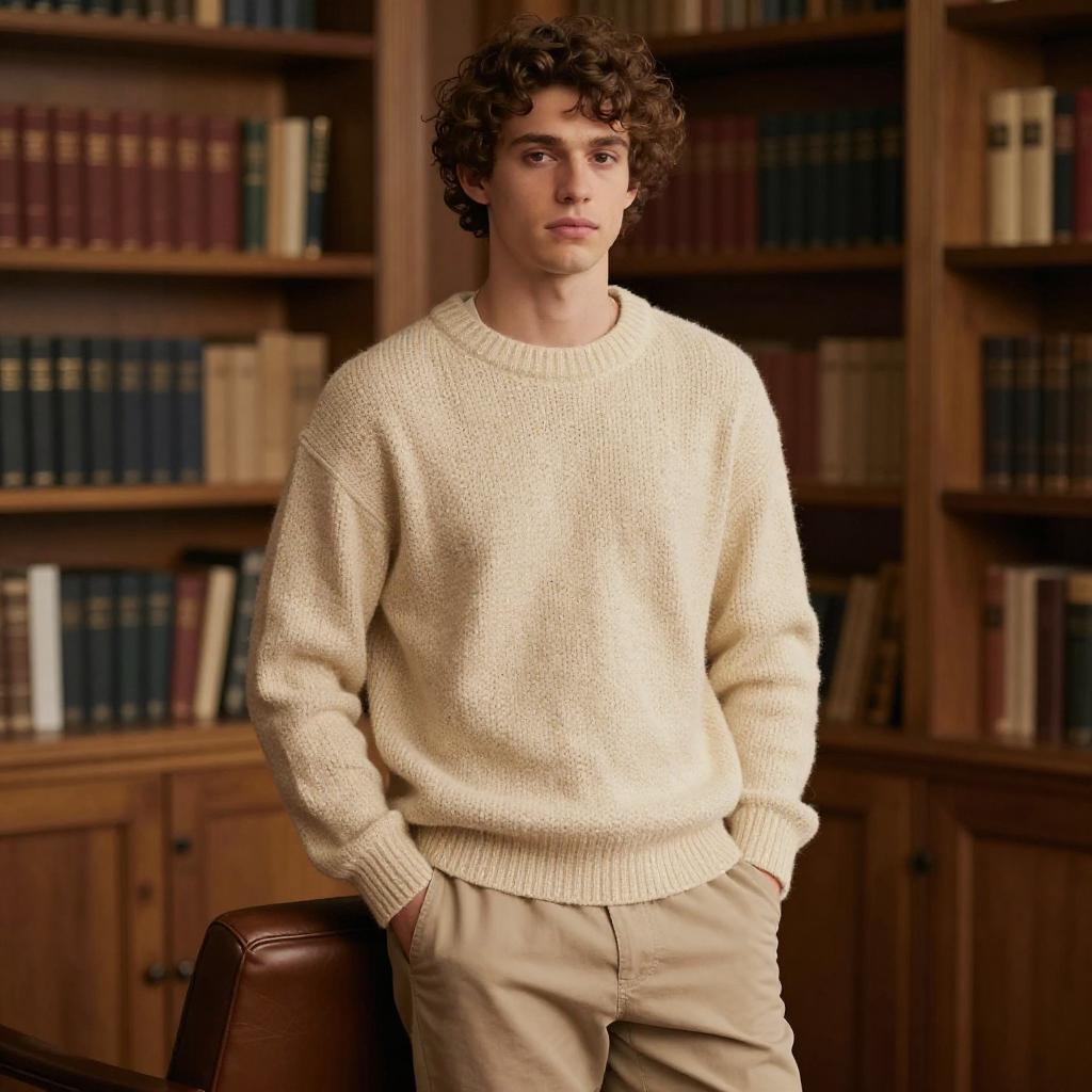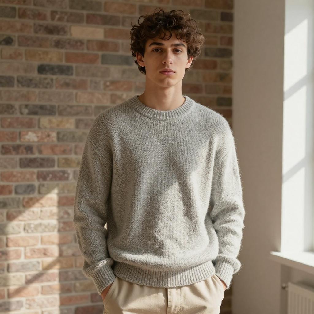 Photograph of a young man with curly brown hair and fair skin, standing in a sunlit room with a brick wall background. He's wearing a light gray, chunky-knit sweater and beige pants with his hands in his pockets. His expression is neutral, and the natural light highlights the textures of the sweater and brick wall. He's centered in the frame, looking directly at the camera.