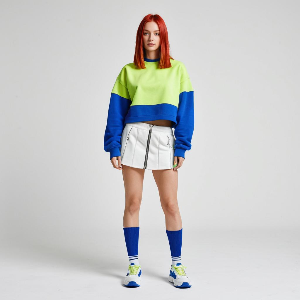 Woman, sporty streetwear, color-blocked oversized sweatshirt in grey, blue, and lime green, crew neck, long sleeves, dropped shoulders, white zipper detail, micro-mini skirt layer in lime green, royal blue high-top sneakers with yellow accents, white socks, minimalist makeup, red straight hair with center part, clean white studio background.