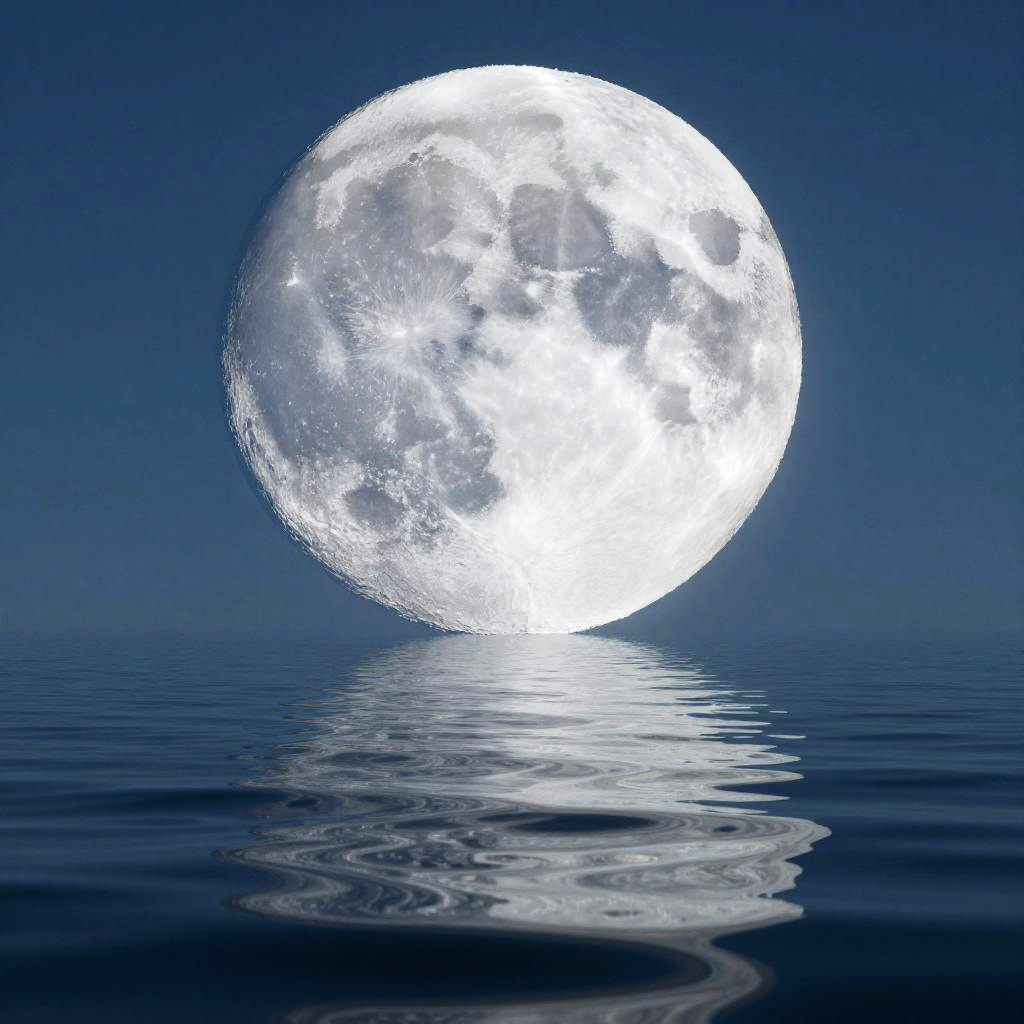 Photograph of a bright, full moon reflecting on a calm, dark blue ocean, creating a clear, mirrored image.
