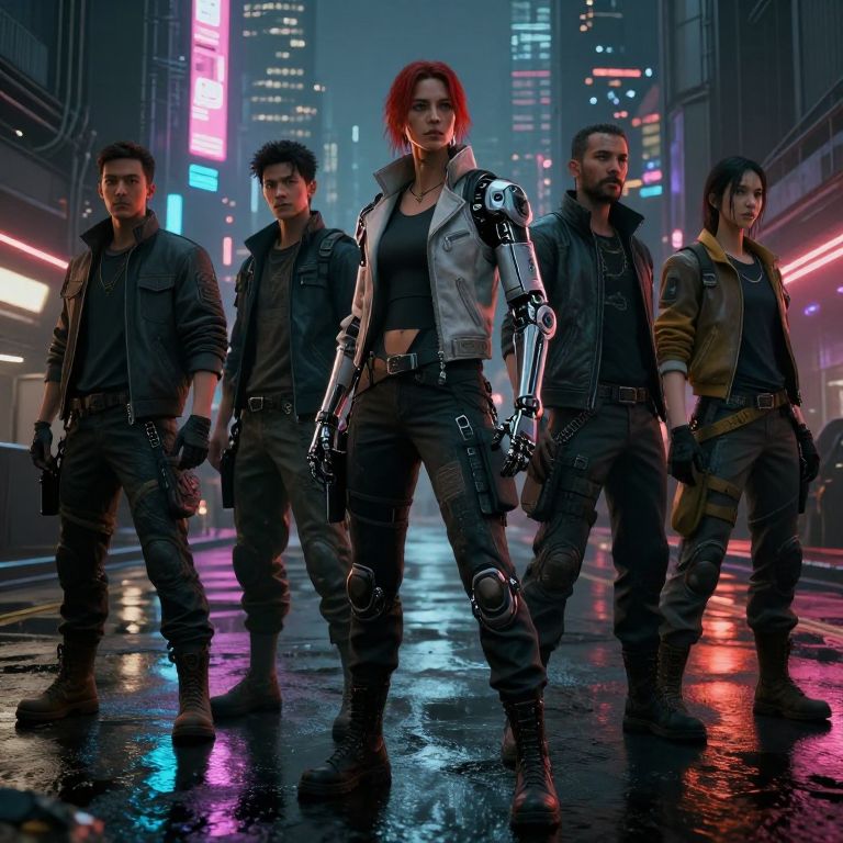 A diverse group of five cyberpunk characters standing confidently in a neon-lit futuristic city at night. The central figure features detailed cybernetic arms and red hair, wearing a sleeveless crop top and tactical pants. The surrounding characters have varied urban tactical outfits and realistic cybernetic enhancements, reflecting vibrant neon lights off the wet street surface. The background showcases tall skyscrapers and glowing digital billboards, creating a high-contrast, immersive cyberpunk atmosphere.