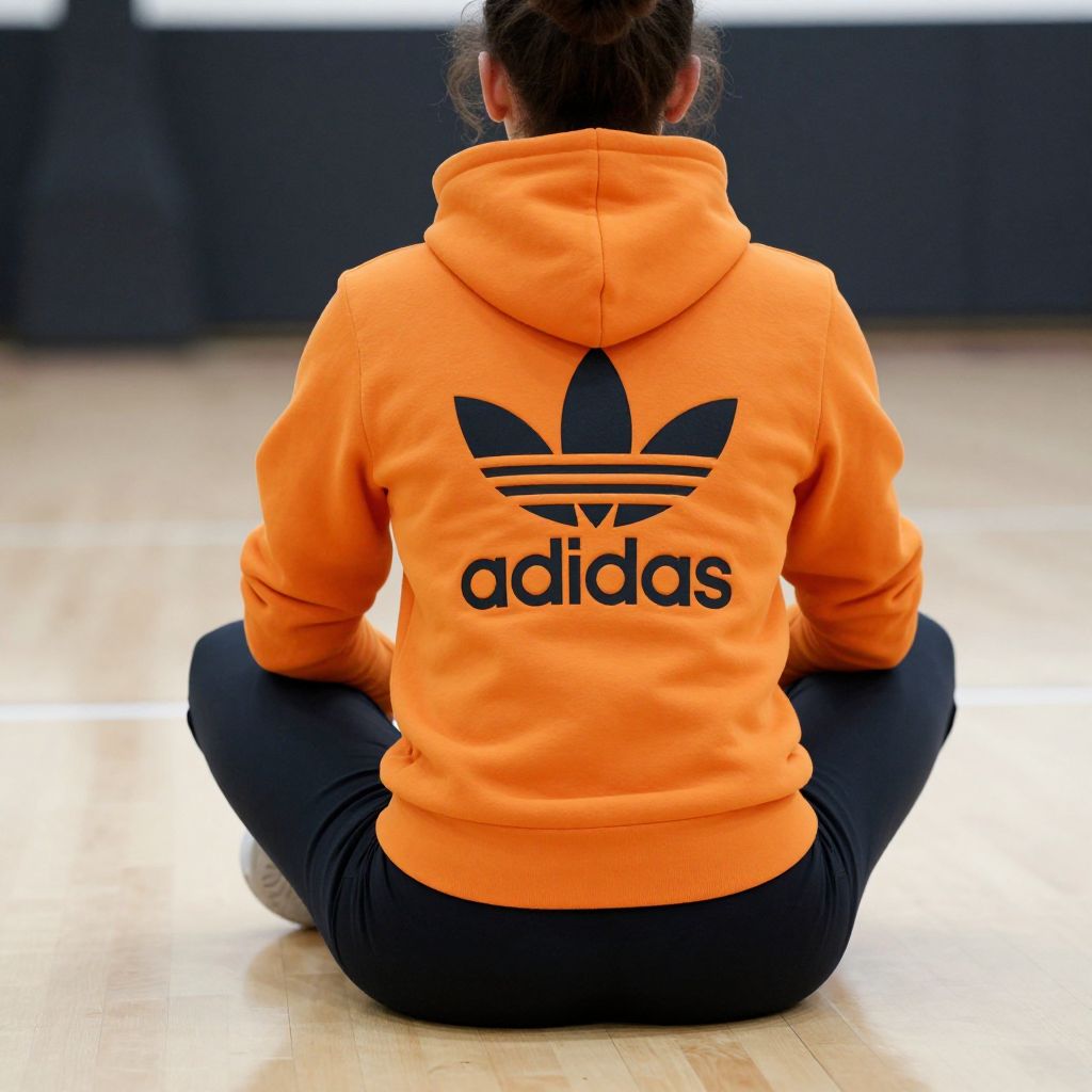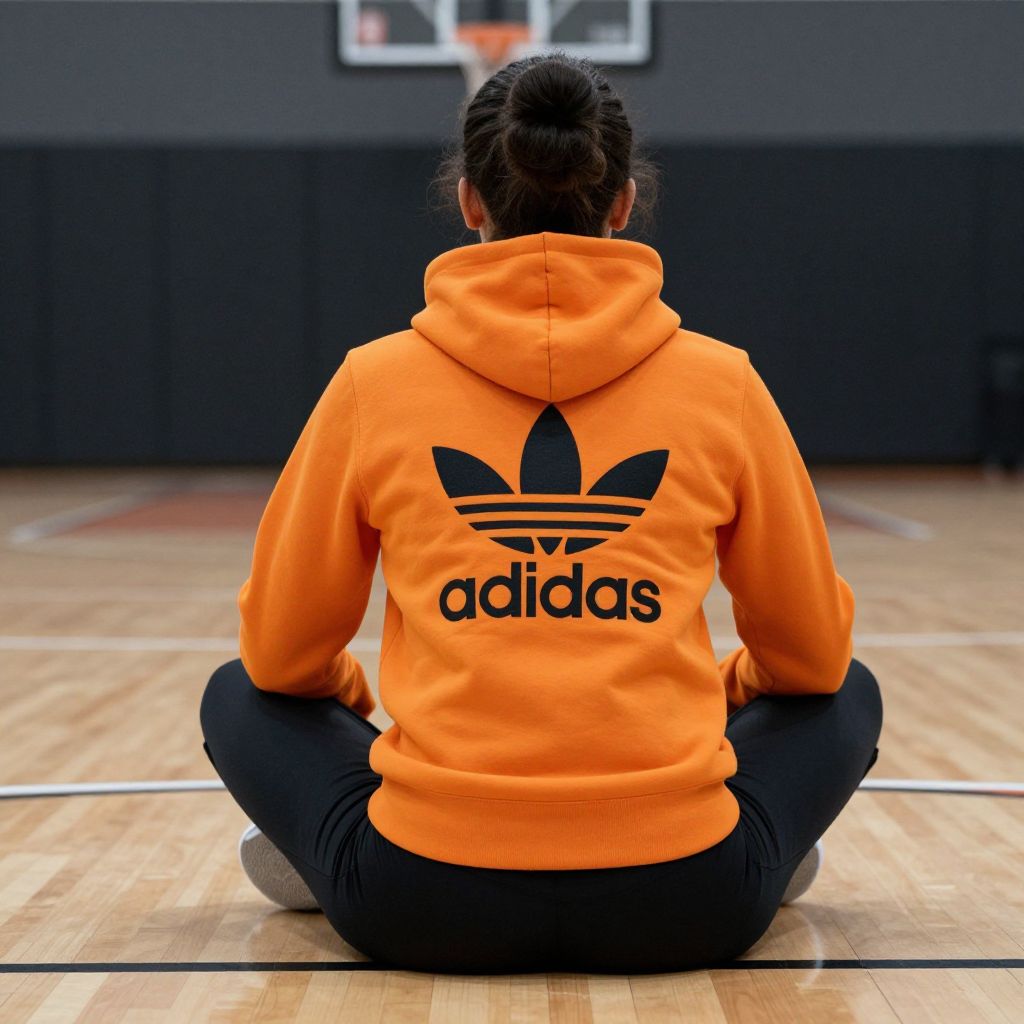 Woman sitting cross-legged on a basketball court, facing away from the camera, wearing a vibrant orange Adidas hoodie featuring the iconic trefoil logo and bold \"adidas\" text, paired with sleek black athletic bottoms.