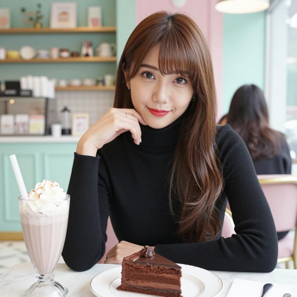 Asian woman with long red hair, bangs, smiling, wearing pink dress with short sleeves, sitting at restaurant table. Plate in front with salad, fried egg, and dumplings. White curtains in background, chairs with wicker seats. Daylight through windows.