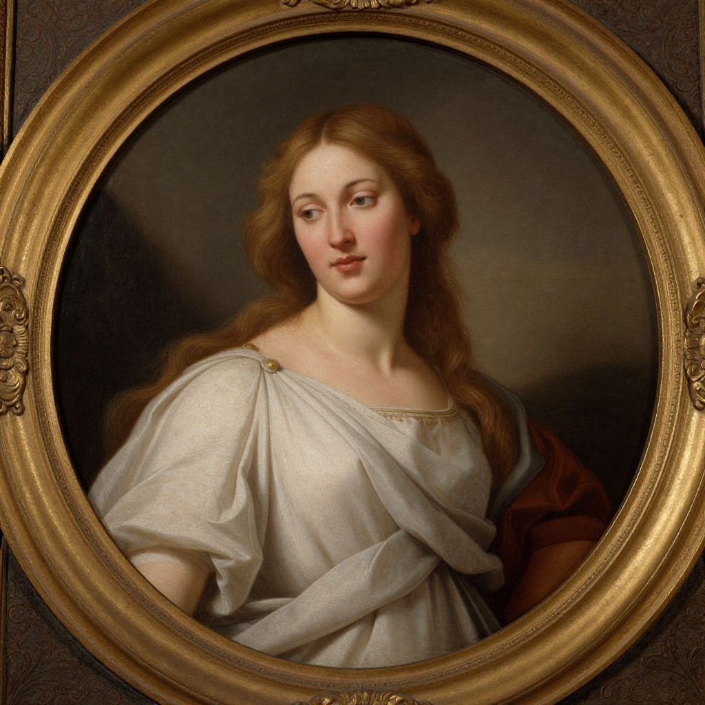 A classical portrait of a woman with flowing hair, wearing a draped garment, set within an ornate circular frame.