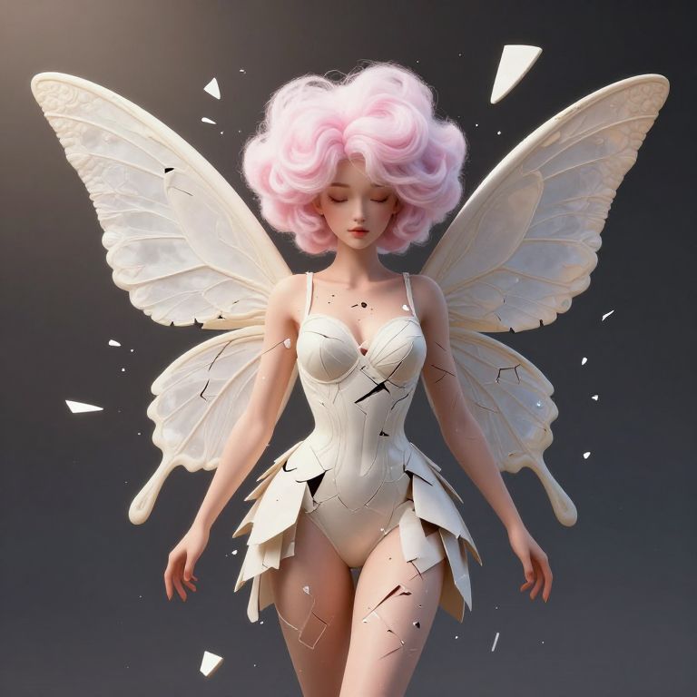 A hyper-realistic, 3D-rendered fairy with cotton candy hair and intricate, off-white wings破碎成无数碎片,背景是戏剧性的光影效果。