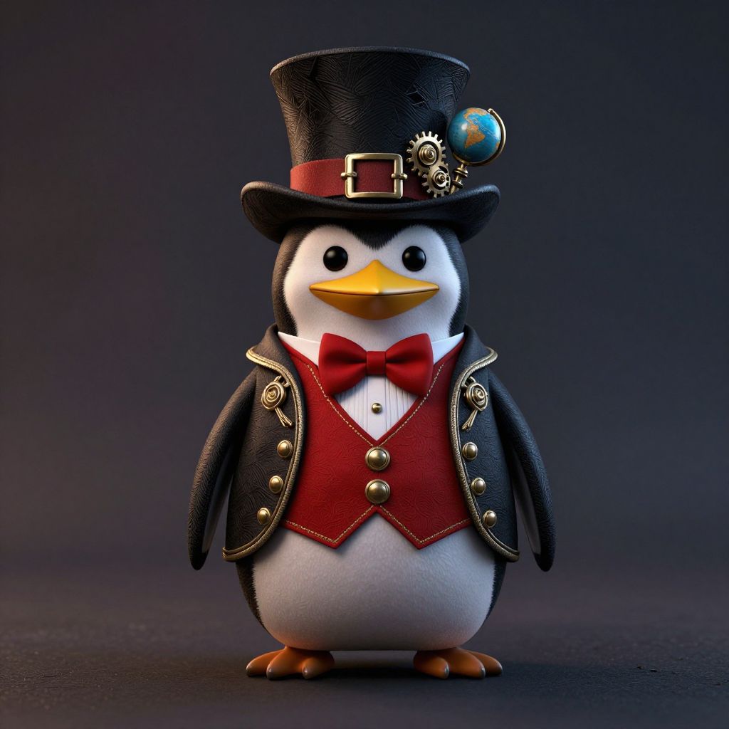 Digital CGI of a penguin in a black top hat with a blue orb, red bow tie, and red vest, standing against a dark blue background