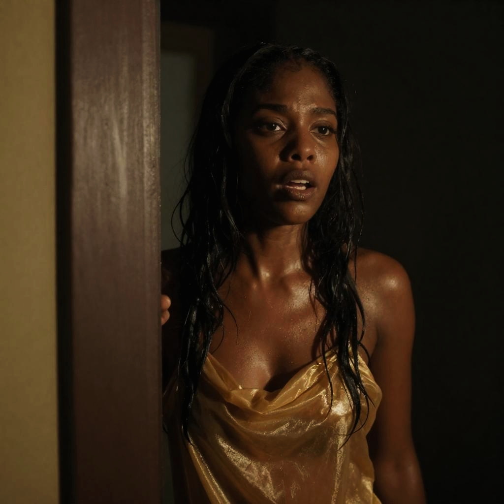 Photograph of a dark-skinned woman with long black hair, wearing a ribbed, beige tank top, standing in a shadowy doorway. Background shows a blurred green sign with white . She has a serious expression, looking slightly downward. Sunlight casts shadows on her face and body.