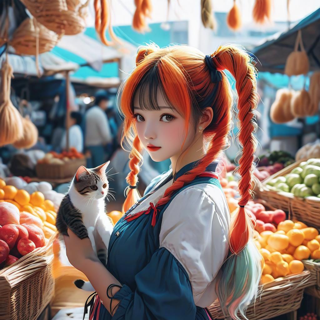 A digital anime-style illustration depicts a young Asian woman with bright orange and blue twin braids, wearing a white blouse and blue pinafore dress, holding a black and white cat. She has fair skin, large eyes, and pink lips. The background is a bustling outdoor market with colorful baskets of fruits like apples, oranges, and green apples, and hanging wicker baskets. The lighting is bright, highlighting the vivid colors and creating a cheerful, lively atmosphere. The woman gazes slightly to the side with a gentle expression.