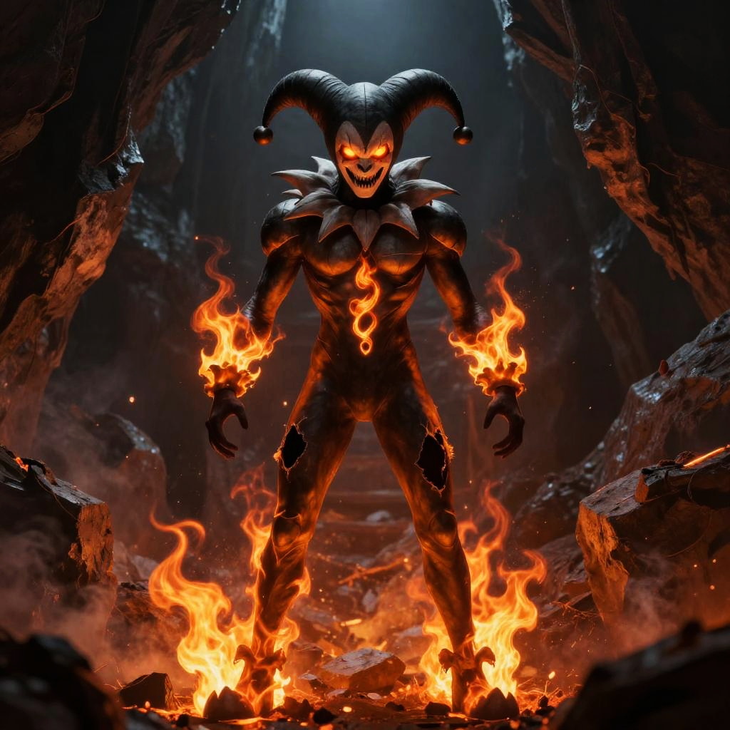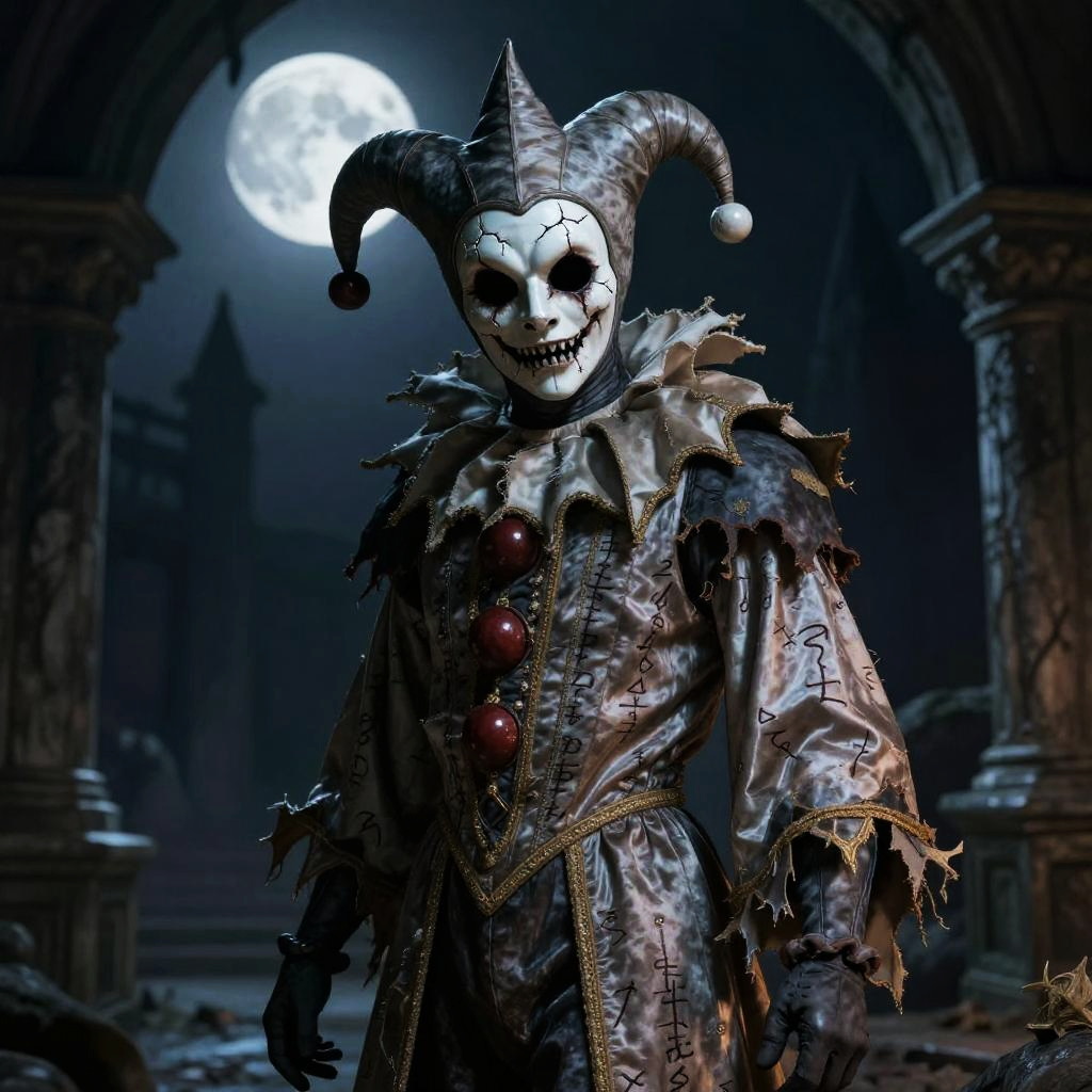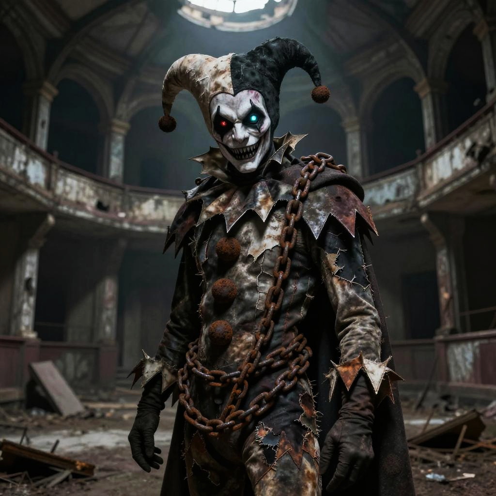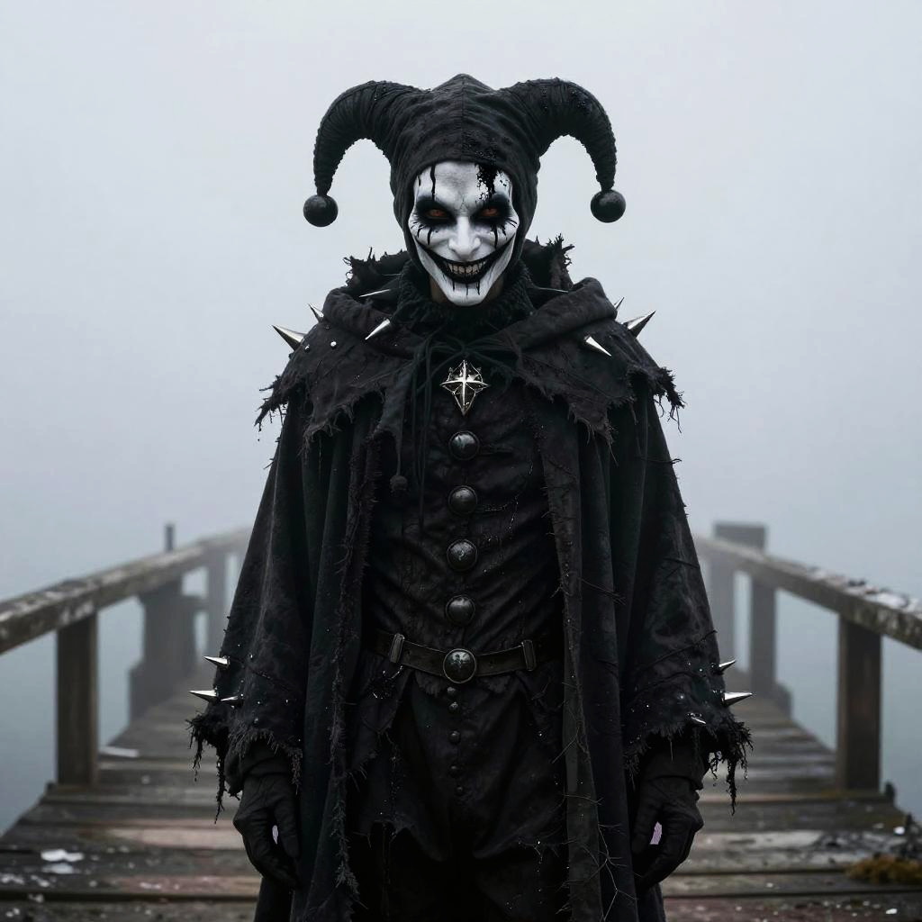 TCG Artwork. A sinister jester with painted smile with dripping black ink wearing shadowy ragged cloak studded with cold metallic spikes, standing in a desolate foggy pier.