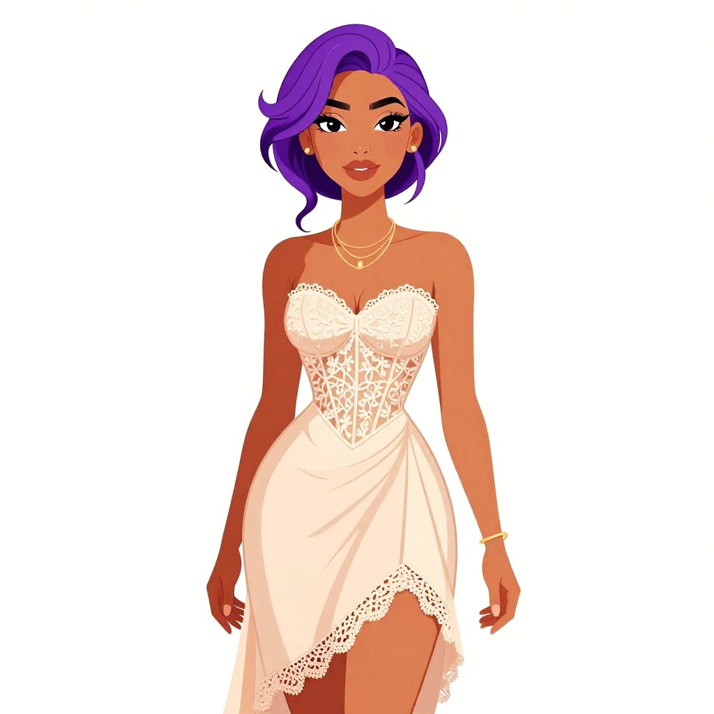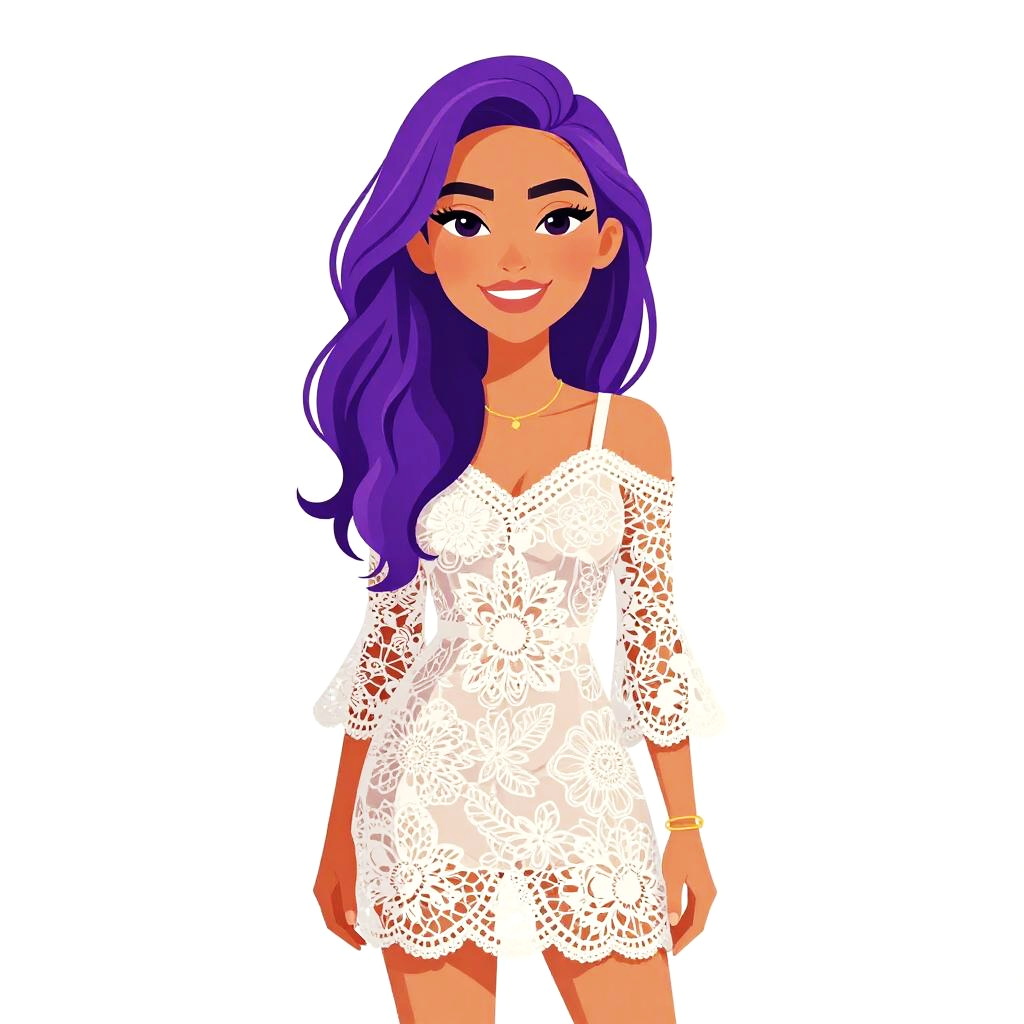 Woman with pretty face and pretty hair. smiling Woman, boho chic, white lace dress with floral pattern, cold-shoulder design, three-quarter length sleeves with flare, scoop neckline, above-the-knee length with scalloped hem, thin gold necklace, minimal bangles, plain white background. --sref 1467