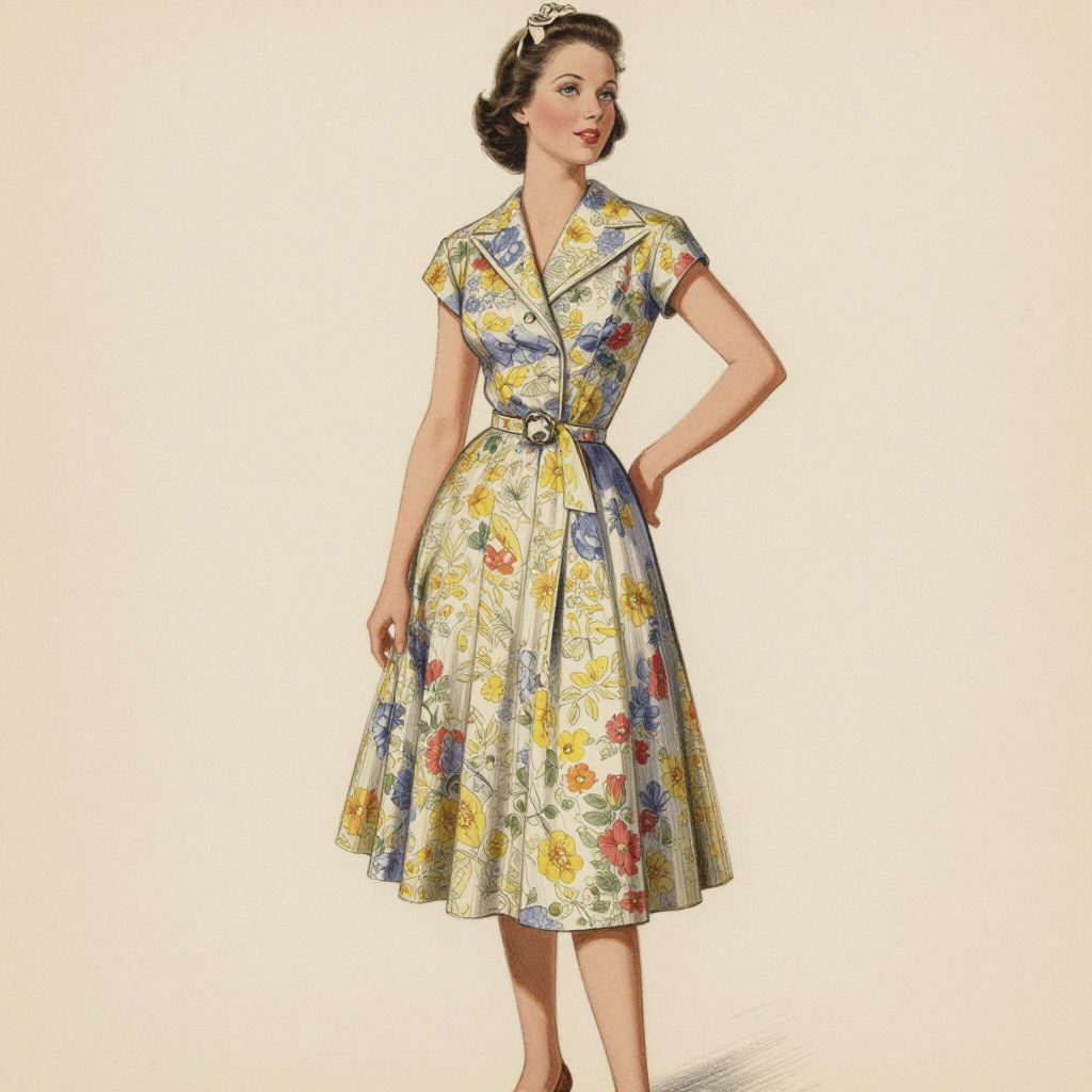 Photograph of a 1950s-style woman in a colorful floral dress with short sleeves, belted waist, and knee-length skirt, standing against