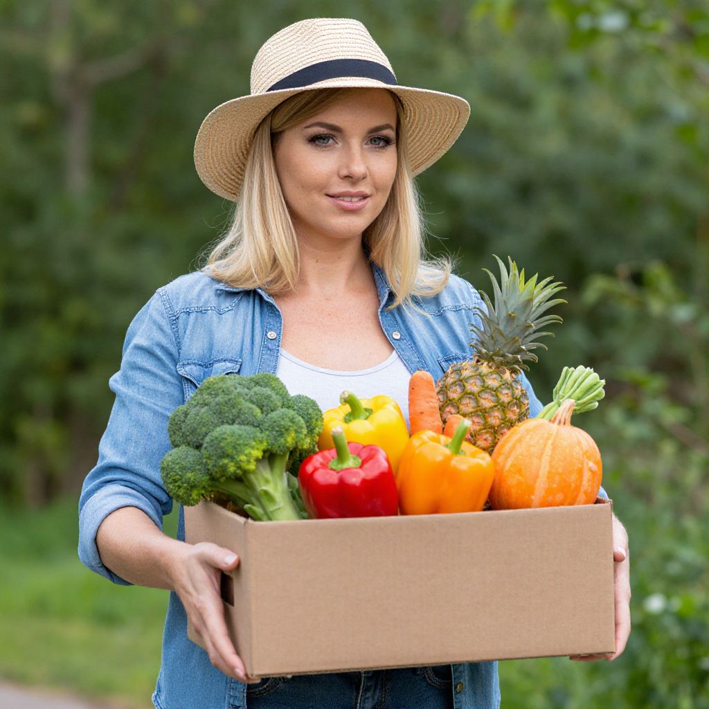 Blonde woman outdoors wearing a straw hat and denim shirt, holding a cardboard box filled with vibrant vegetables and fruits, including broccoli, bell peppers, carrots, pineapple, and squash, set against a lush green backdrop.