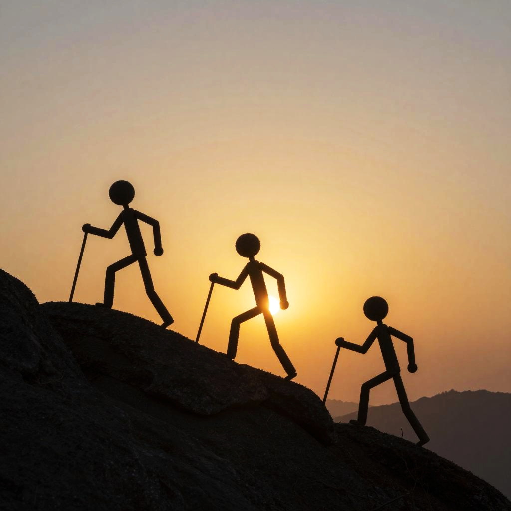 Three stick figures climbing a mountain, outlined in black with minimal details, dramatic vibrant sunrise in background, metaphor for teamwork and achievement