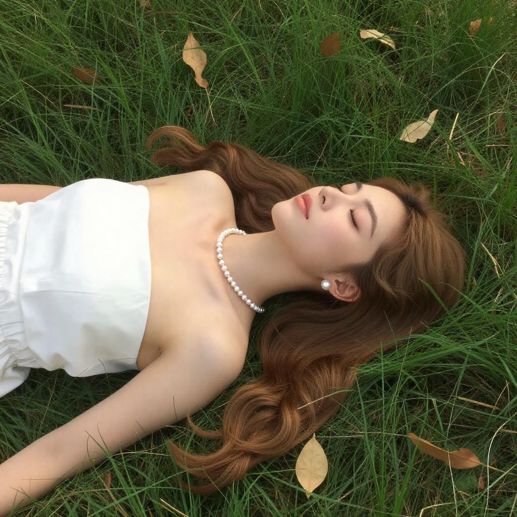 Photograph of a young woman with light brown, wavy hair lying on her back in tall green grass. She has closed eyes, a calm expression, and is wearing a strapless white dress with a pearl necklace and pearl earrings. The grass surrounds her head, and a few dry leaves are scattered around. The lighting is natural, highlighting her fair skin and relaxed demeanor.