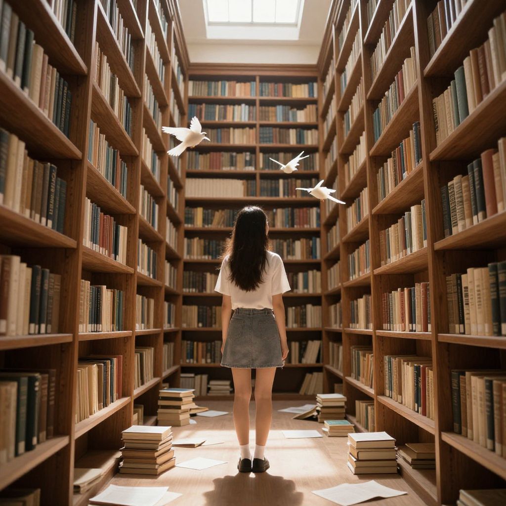 Photograph of a young woman with long black hair standing in a narrow, well-lit library aisle. She faces away, wearing a white t-shirt and a blue denim skirt, with black shoes. Wooden bookshelves filled with books line both sides, stretching into the background. Two white birds fly above her head, illuminated by natural light from a skylight above. Stacks of books lie on the floor at her feet. The scene evokes a sense of solitude and curiosity, with warm, earthy tones dominating the image.