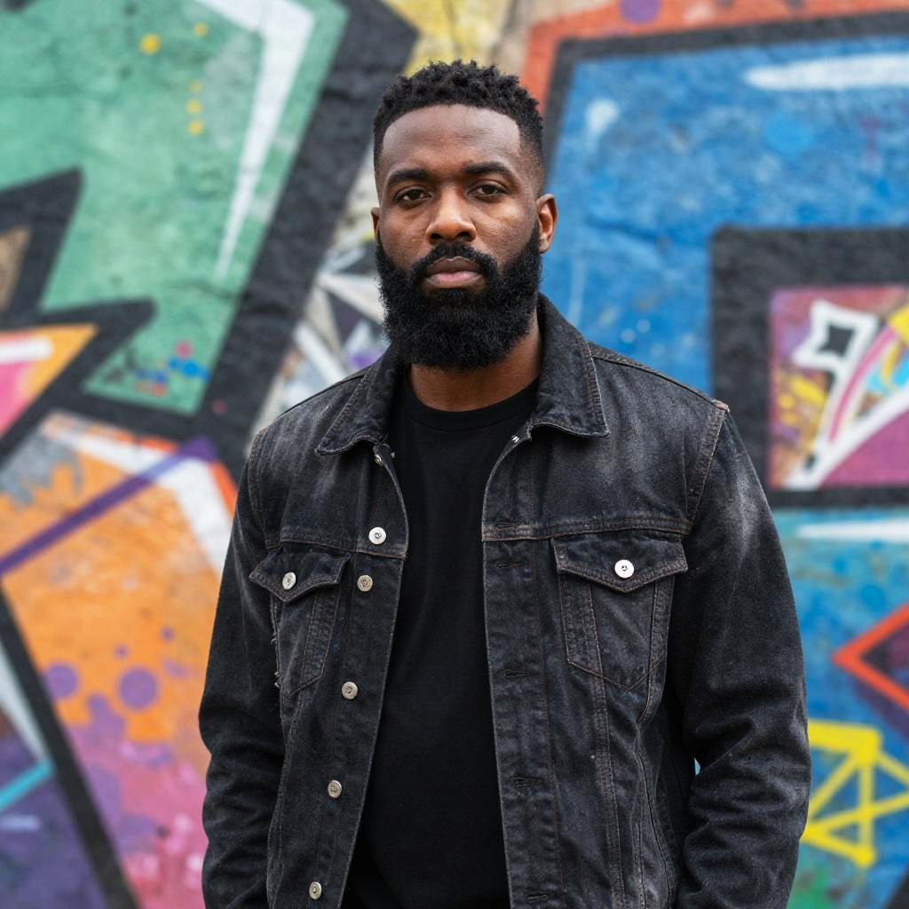 Stylish van Dyke beard black man against abstract colorful graffiti wall, trendy streetwear outfit, strong confident gaze, highlight on beard shape and texture, vibrant urban environment, dynamic composition, mid shot photo, rich color palette