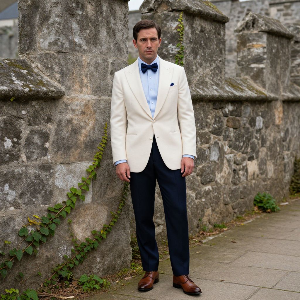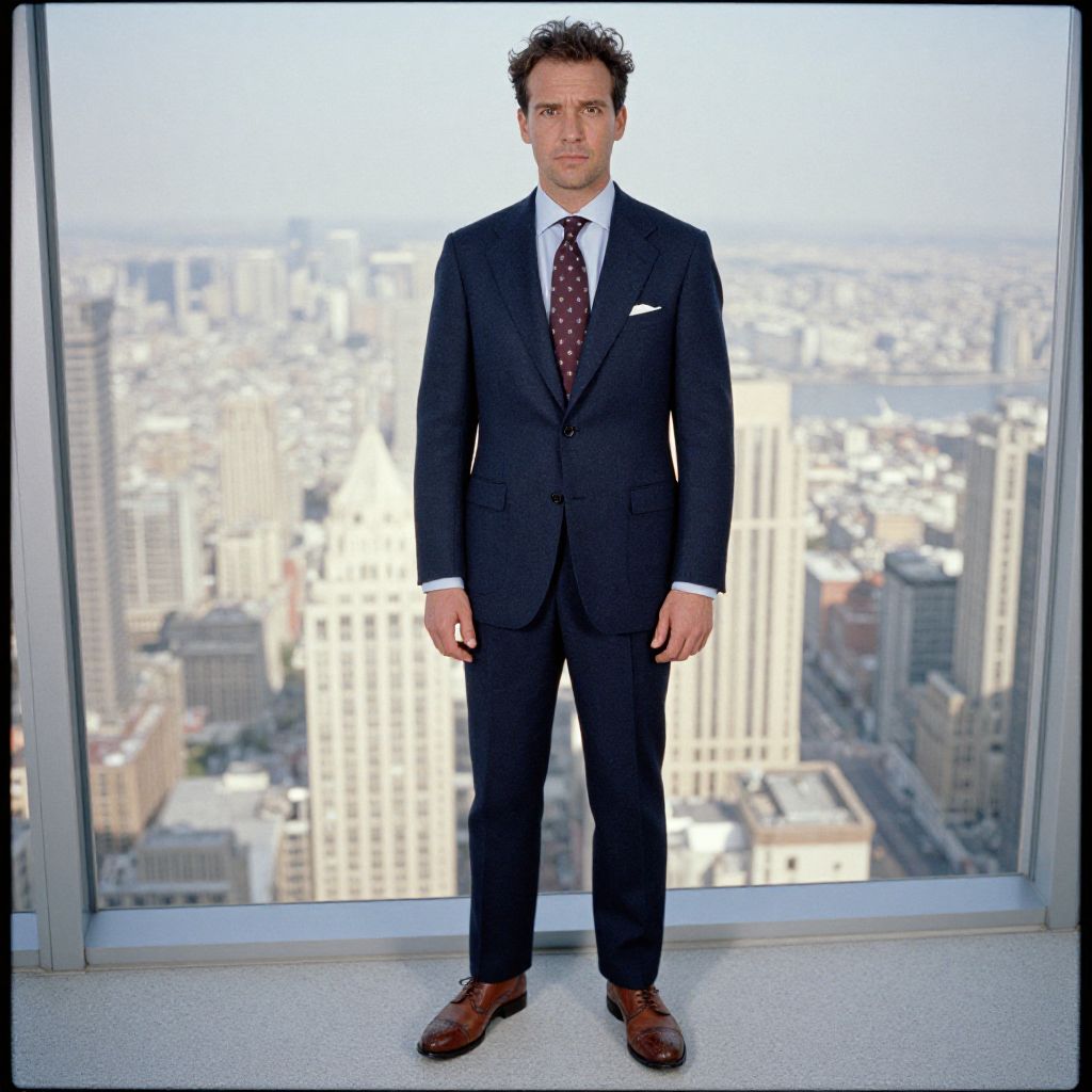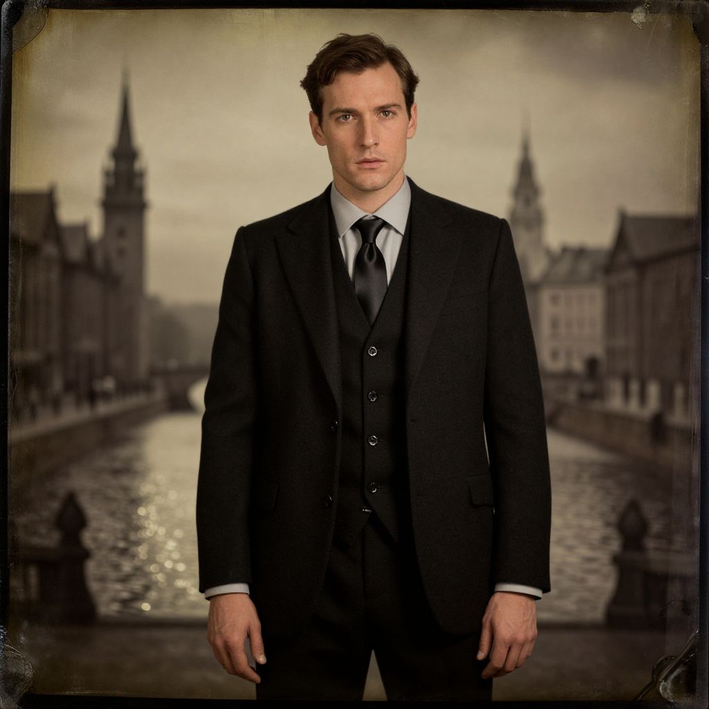 A man, charcoal gray tailored suit, light blue dress shirt, patterned silk tie, brown leather dress boots, expansive runway, vintage aircraft on display, vibrant blue sky overhead, collodion wet plate style, confident expression Man has masculine face and piercing eyes