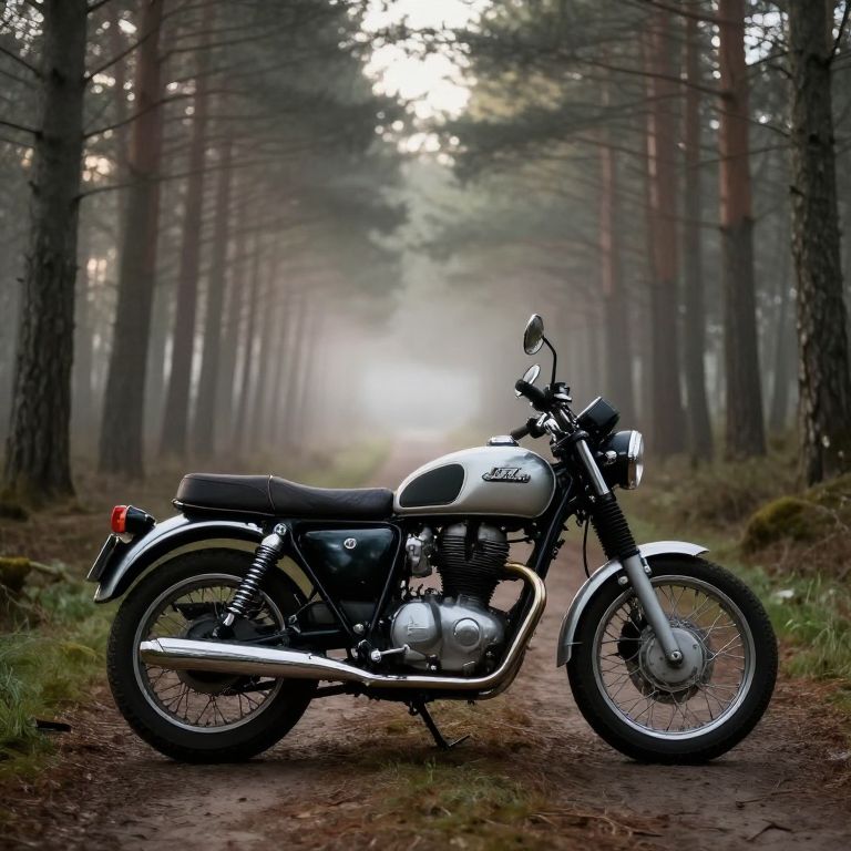 Photograph of a classic silver and black motorcycle with chrome accents parked on a forest dirt path, surrounded by tall pine trees and misty light in the