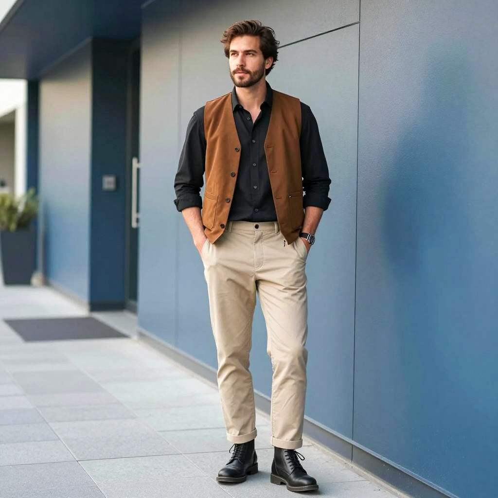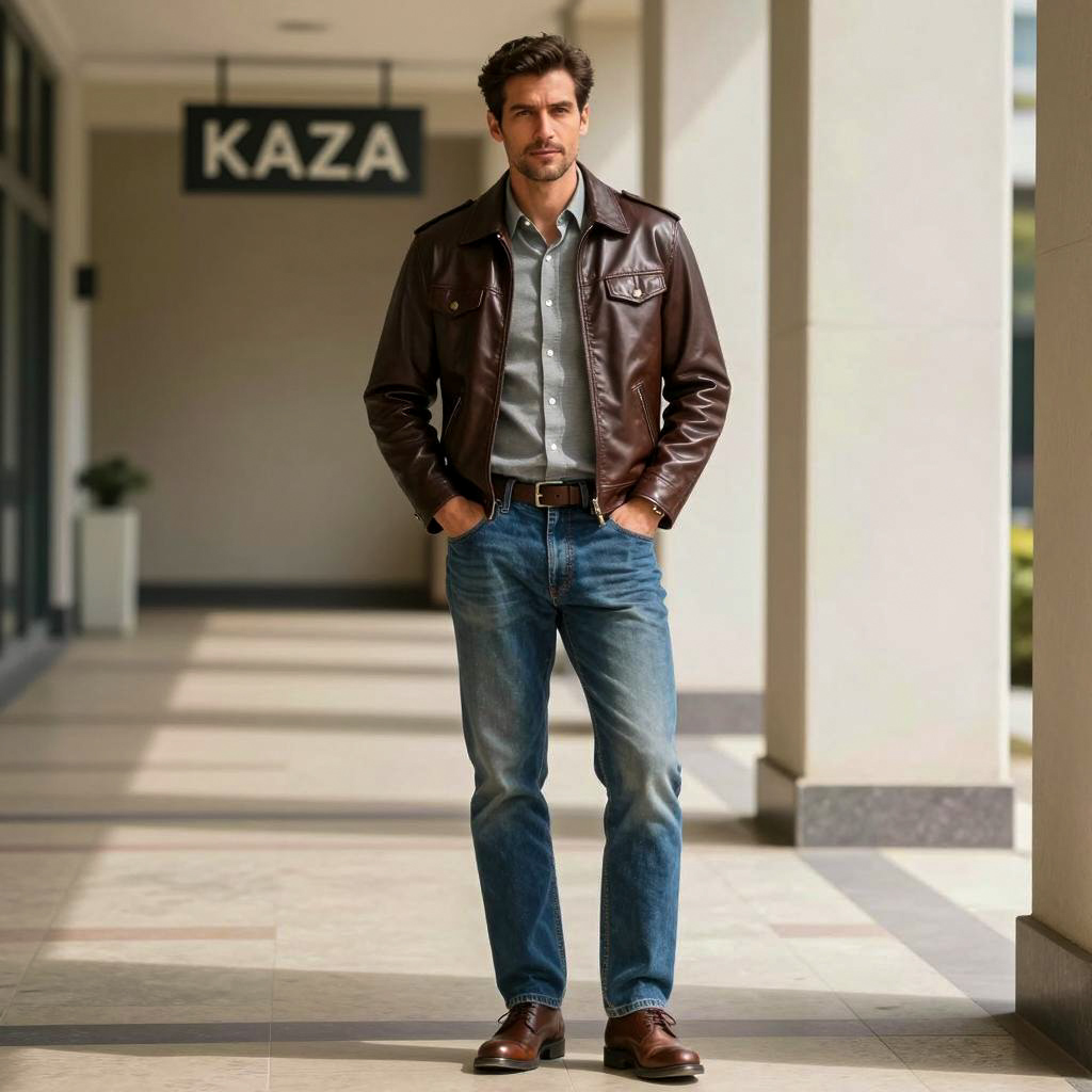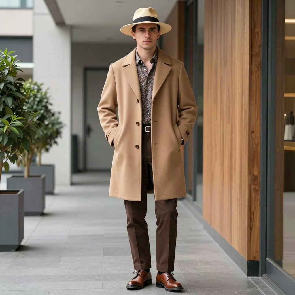 Browns menswear costume, photorealistic, handsome young man, brown leather three-piece suit, brown fedora, blue shirt, brown belt, hands in pockets, standing, daytime, front view, urban background, yellow plant pot, wooden beams, potted plants, sunlit, stylish, confident, modern vintage look, full body shot
