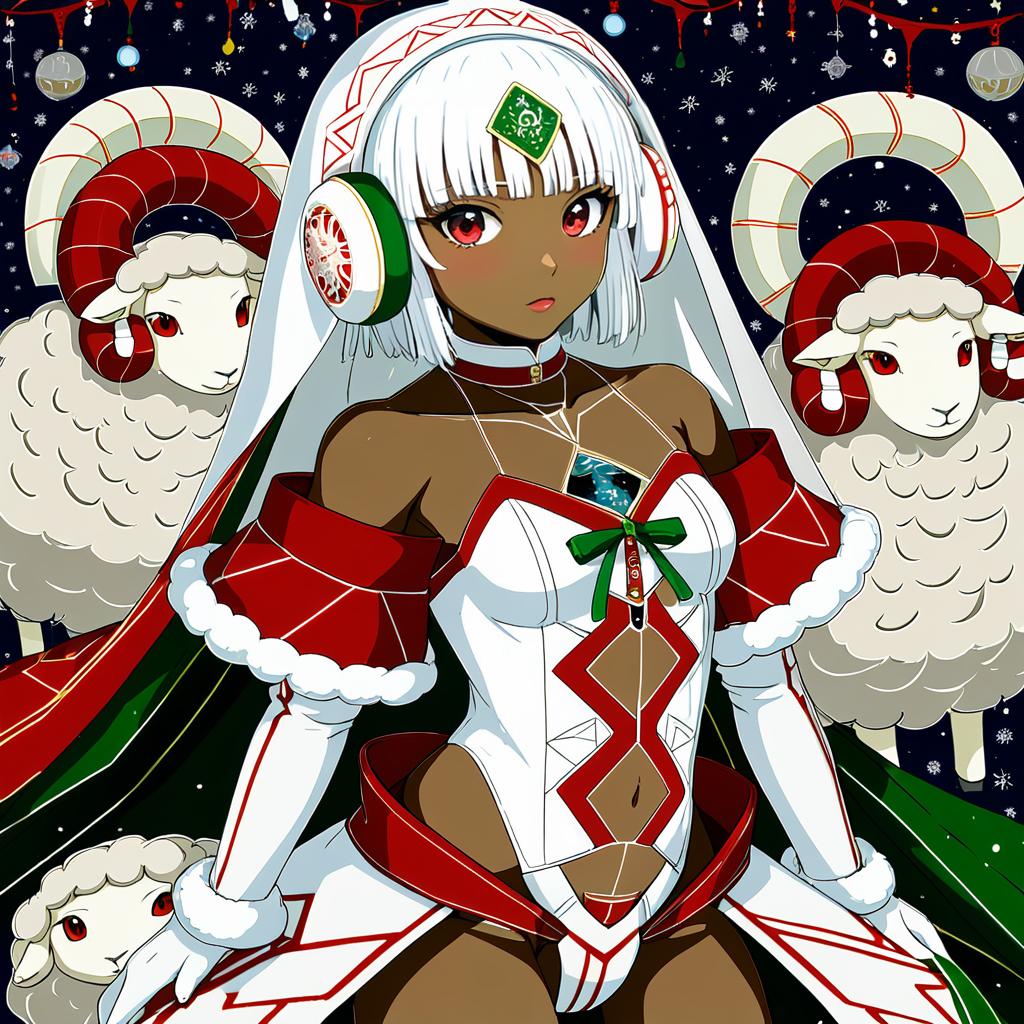 Full-body illustration of a dark-skinned female anime character with short white hair and red eyes, wearing a festive Santa-inspired outfit featuring a white and red corset with green accents, detached sleeves, white mittens, a choker, and a veil. The character is posed in front of three sheep with red curled horns against a starry night background decorated with hanging ornaments. The style is anime, detailed with a full-body tattoo and Christmas-themed accessories.
