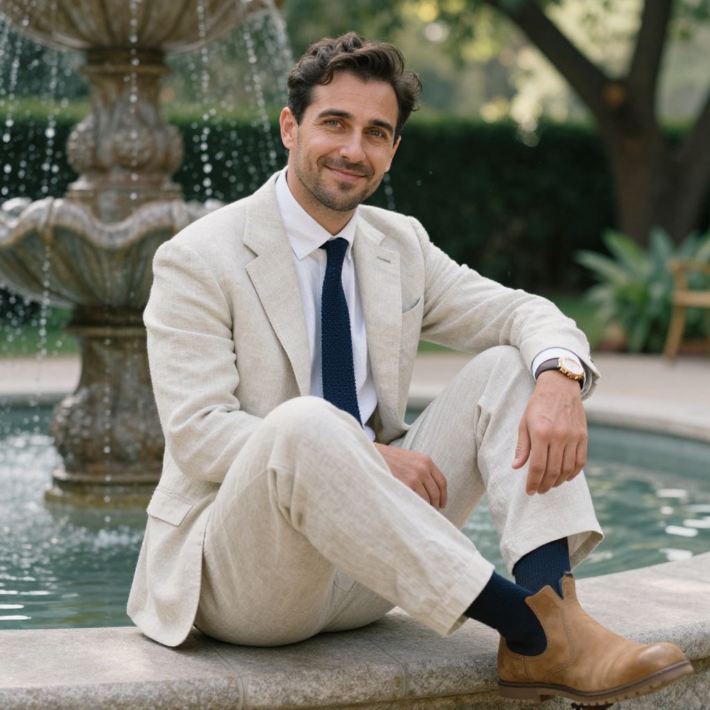 A man, light beige linen suit, white linen shirt, navy knitted tie, tan leather Chelsea boots, summer-friendly fabric, serene garden, soft sunlight filtering through trees, tranquil water fountain, medium format film, relaxed smile, confident demeanor. Man has masculine face and piercing eyes