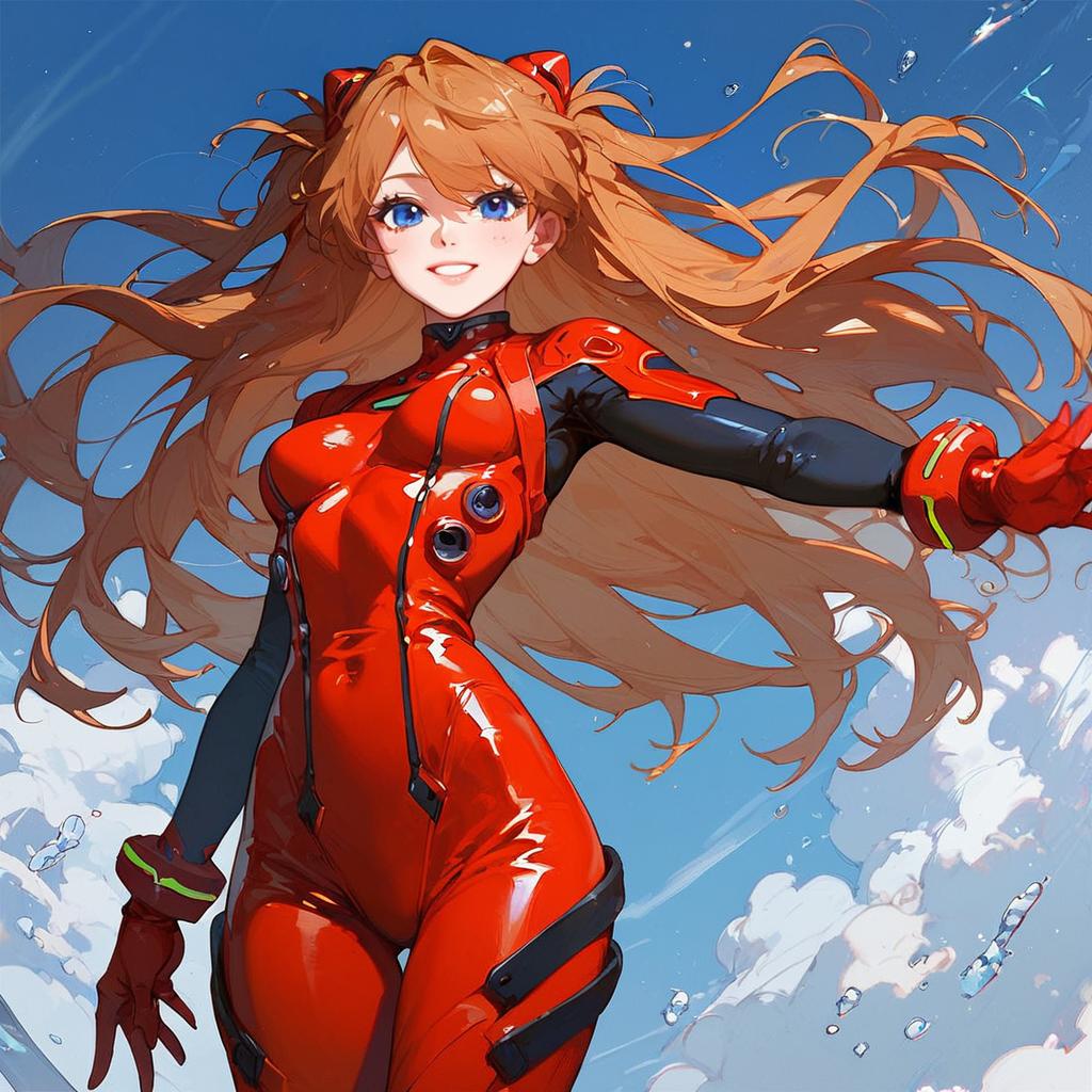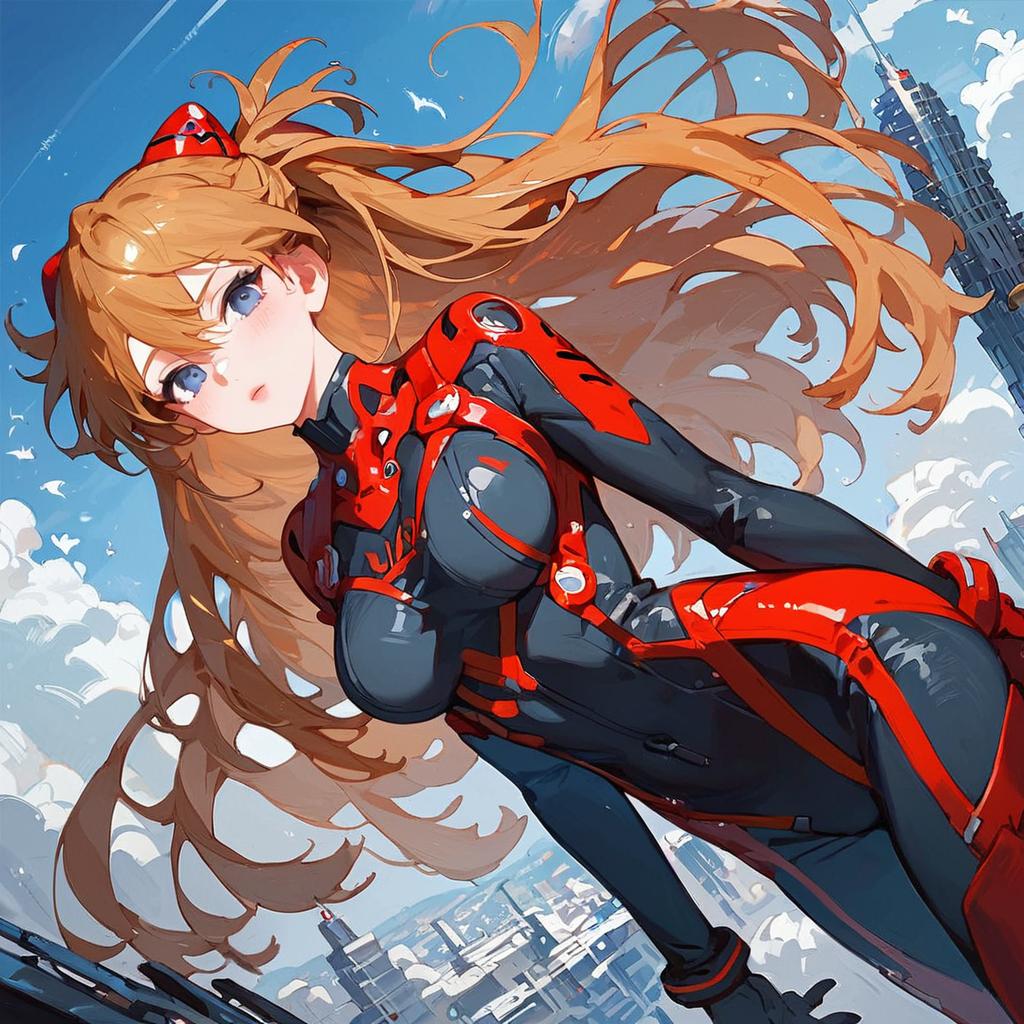 Score_9, score_8_up, score_7_up, source_anime, asukalangley, asuka langley soryu, long hair, bangs, blue eyes, brown hair, hair ornament, mature female, bodysuit, pilot suit, plugsuit, red bodysuit, interface headset, outdoors, cityscape, sky, clouds, sun, looking at viewer, cowboy shot, dutch angle, dynamic pose