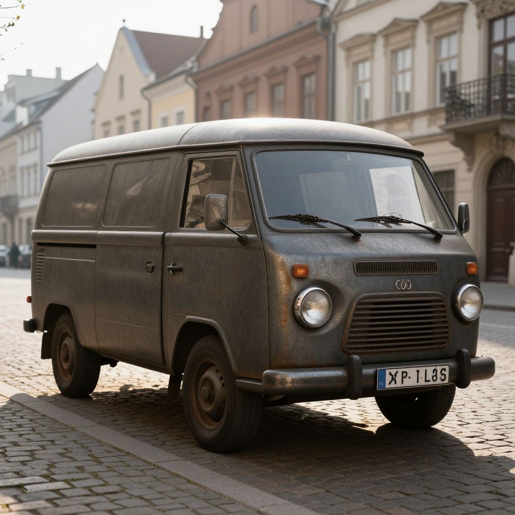 Barkas delivery van, vintage East German style, detailed rusty metal textures, parked on cobblestone street with old European buildings in background, early morning soft light, cinematic atmosphere, lens flare, ultra-realistic rendering