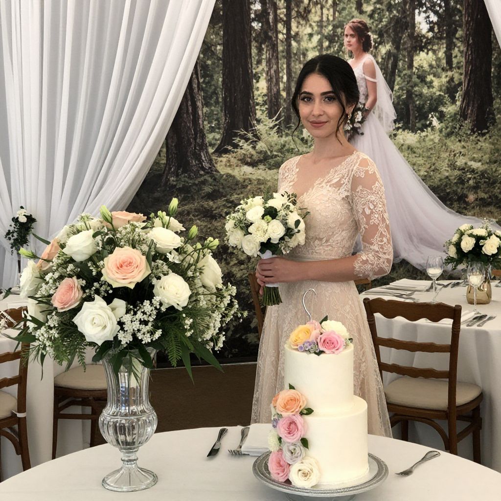 Photograph of a bride standing in an outdoor forest setting with tall trees in the background. She has dark hair in an updo and wears a long-sleeved, lace, ivory wedding dress. She holds a bouquet of white and pink roses with green foliage. A second bride in a white dress with a veil stands in the background. In the foreground, a round table with a white tablecloth features a glass vase of similar flowers and a white, three-tiered cake with pink roses. White curtains frame the scene. The image has a slight vintage filter, adding warmth and softness.