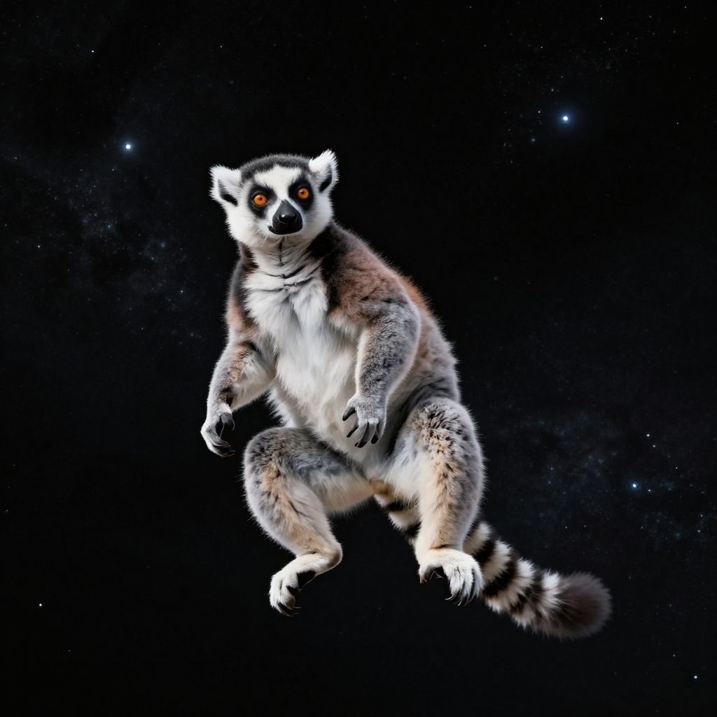 Photorealistic: weightless lemur, floating, unsupported, in outerspace, space, cosmos, only stars in the background