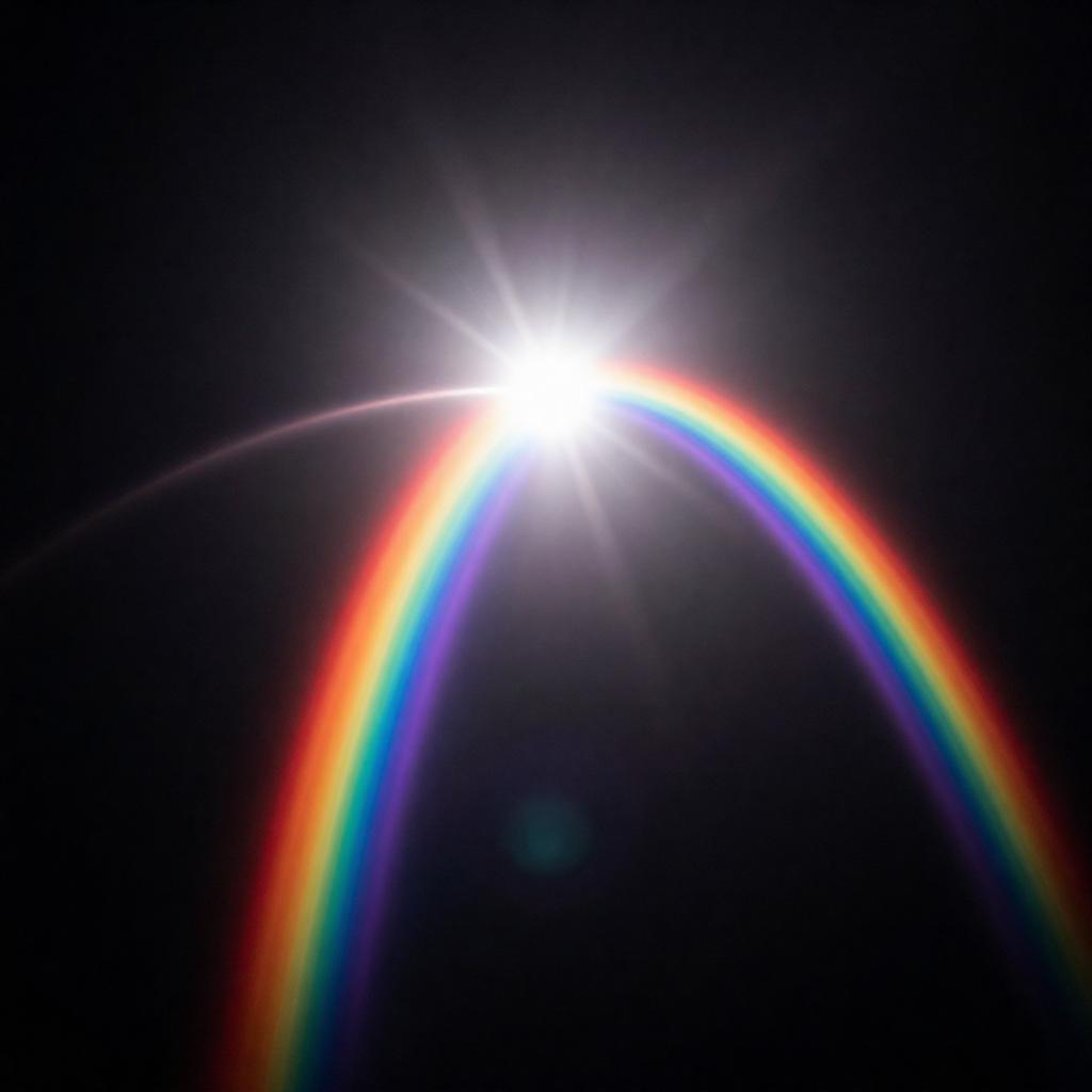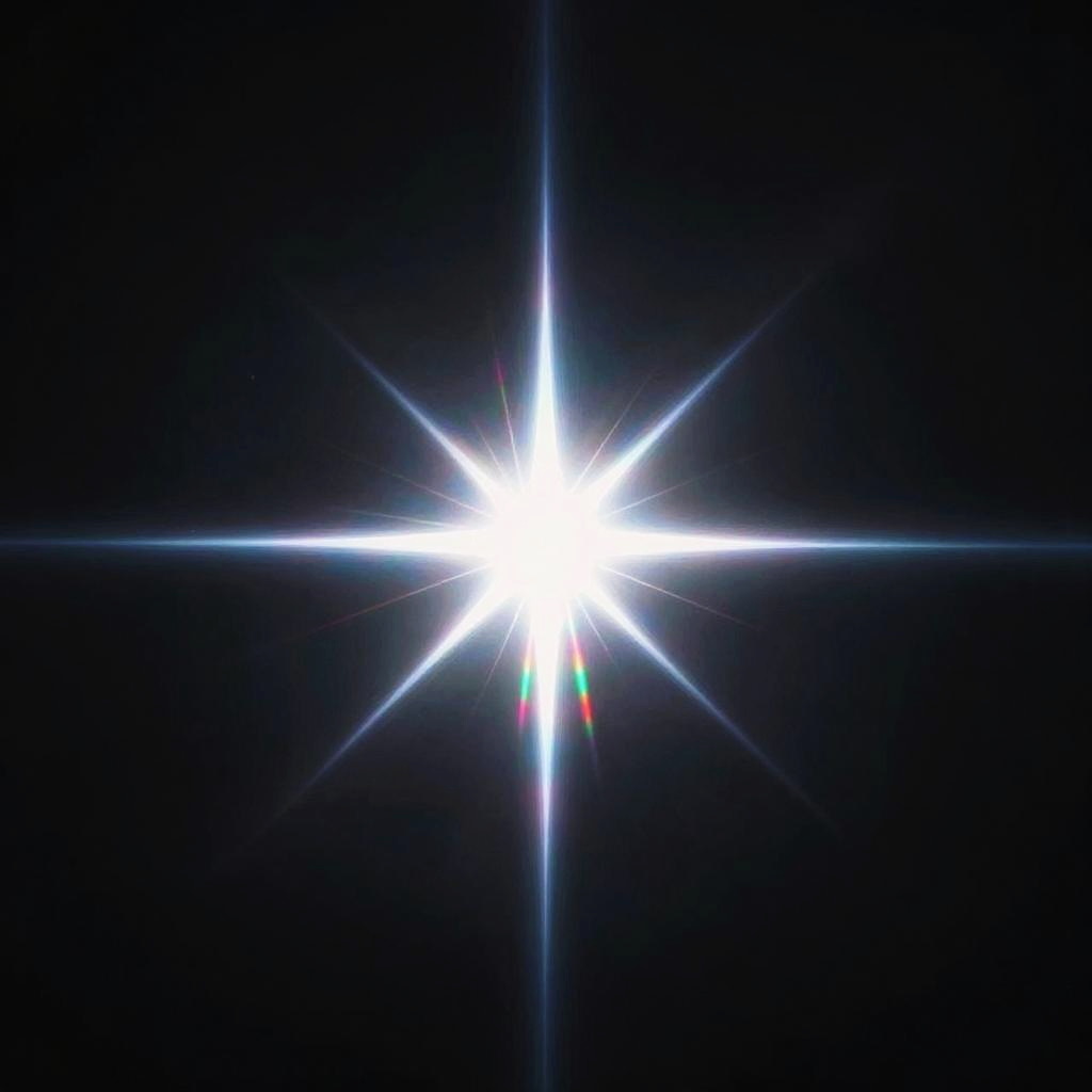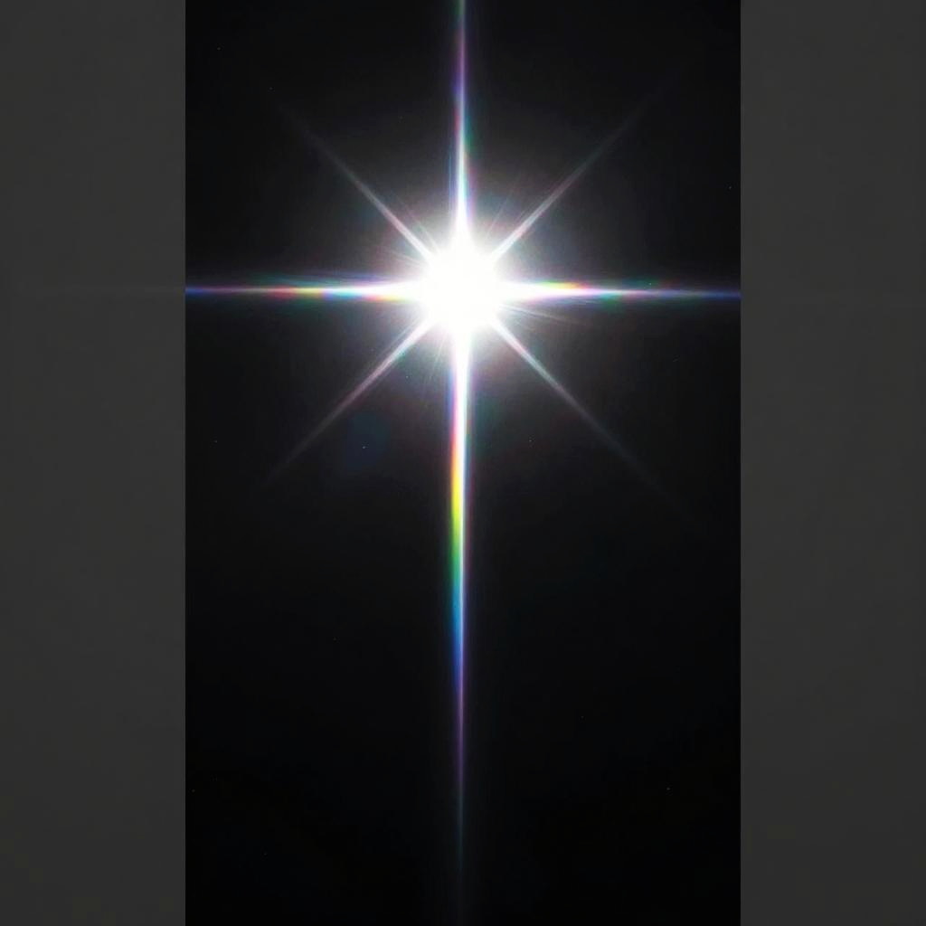 This is a digital image of a bright, star-like light source centered against a black background. The light has a white core with radiant beams and a colorful, vertical rainbow-like flare extending downwards. The image has a symmetrical, vertical format with gray borders on either side. The light creates a sense of depth and intensity, resembling a cosmic or celestial event.