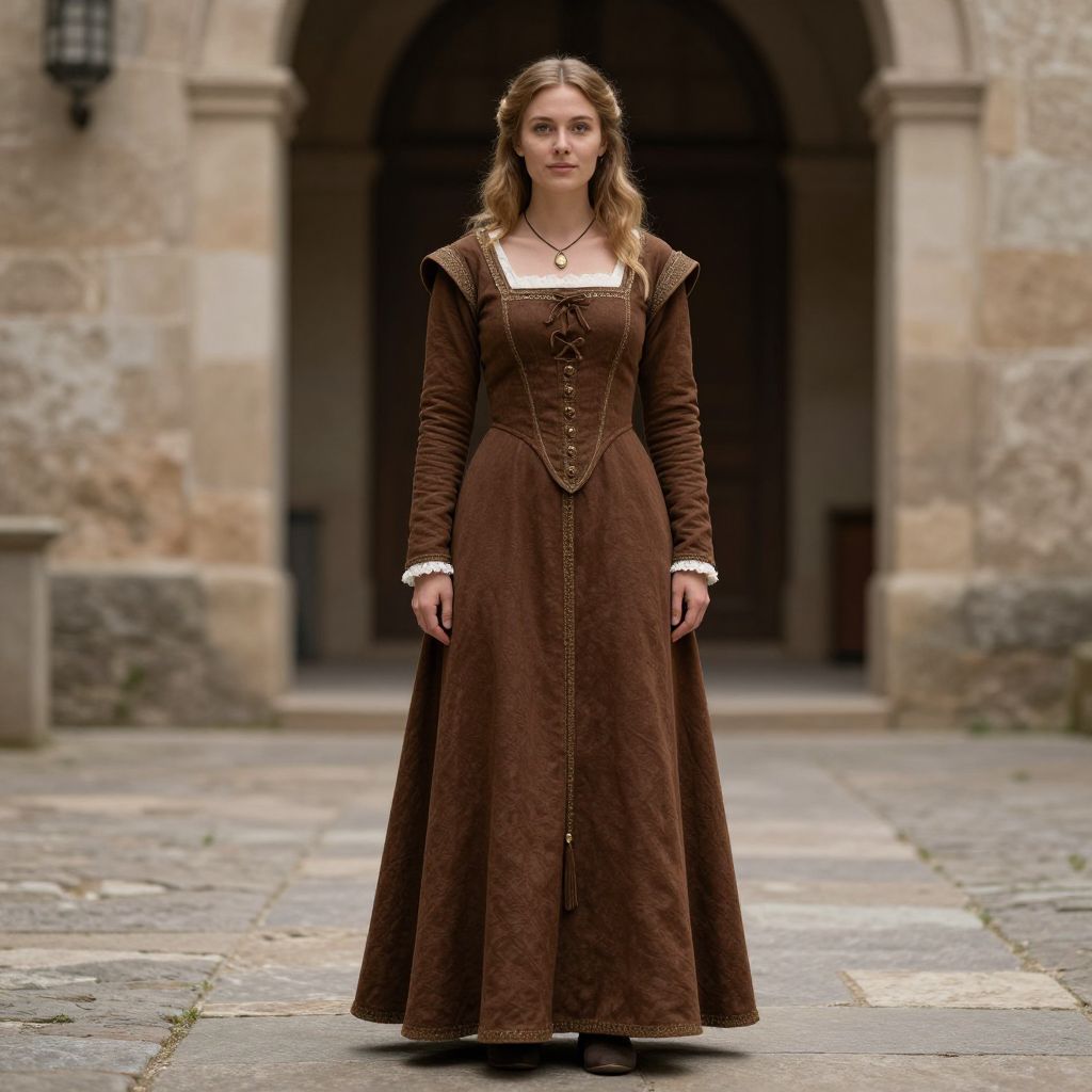 Photograph of a young woman in a brown medieval-style gown with long sleeves and lace trim, standing in a stone courtyard.