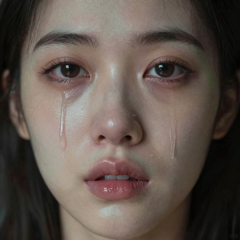 A highly detailed and intricate portrait of a person with tears streaming down their face, featuring a mix of realistic and surreal elements, captured with a 50mm lens and detailed color grading.