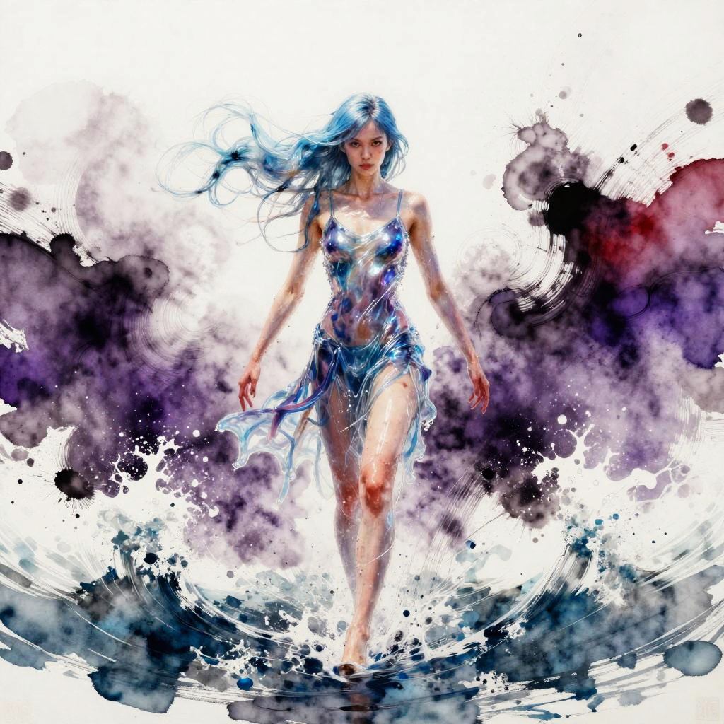 1girl water yushushui, solo, light_blue_hair, liquid hair, long hair, floating hair, full body, standing, sundress, liquid clothes, iridescent, water, waves, tsunami, tide, sea, water dress, fantasy, high contrast, ink strokes, explosions, over exposure, purple and red tone impression, abstract, water bender, warrior, dynamic pose, action pose, serious, intense, focused, superhero, ((watercolor painting by John Berkey and Jeremy Mann )) brush strokes, negative space, perfect lighting, perfect shading, (stunning, beautiful, gorgeous), 8k, wallpaper, masterpiece, (photorealistic:1.5), (mature adult:1.3), centered, (beautiful face, beautiful hair)