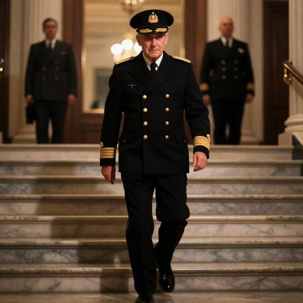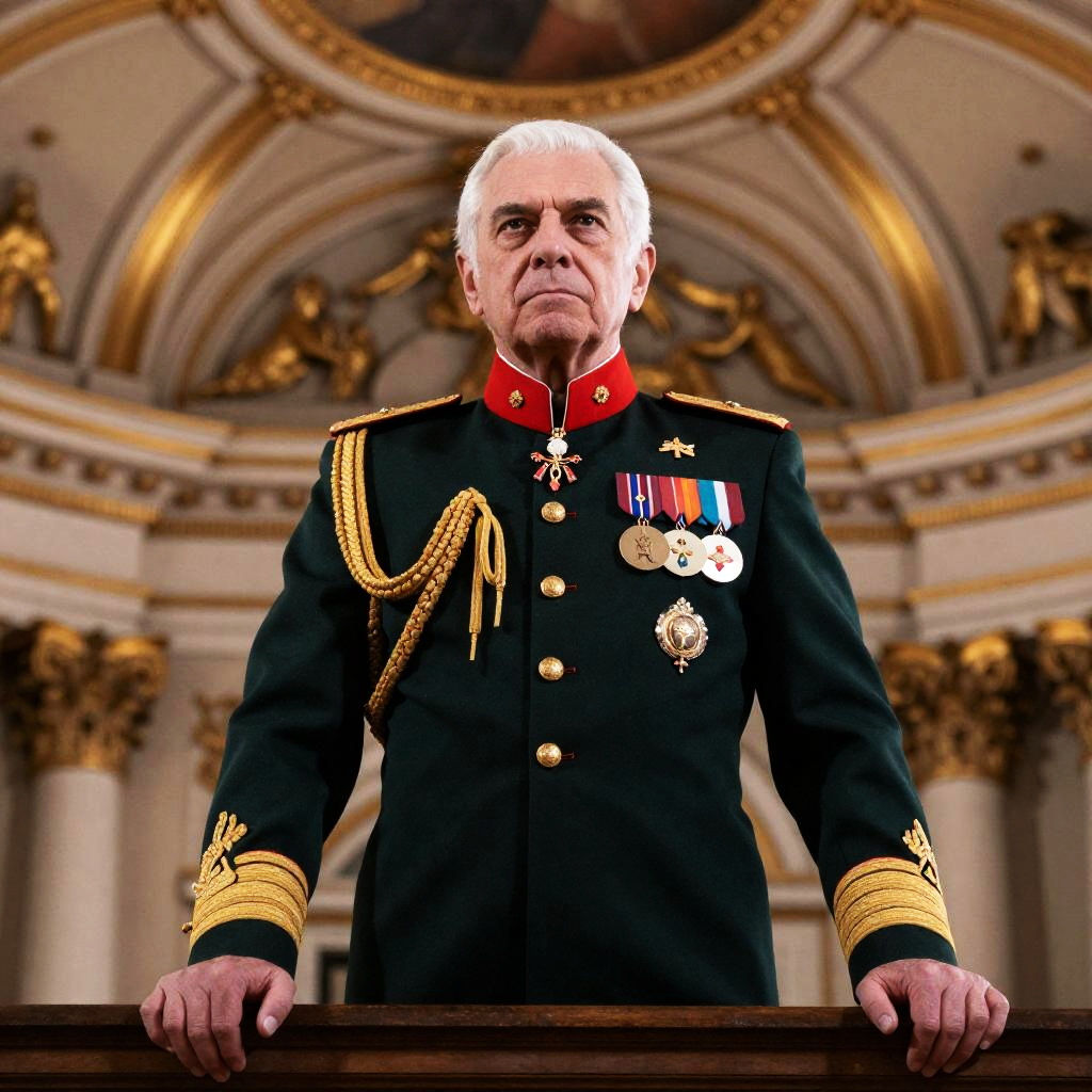 Older man in military uniform with gold epaulettes, red collar, and numerous medals. Dark green jacket, white hair, stern expression. Background: ornate, golden, baroque-style ceiling. Man leaning on dark wooden railing. Formal, authoritative pose.