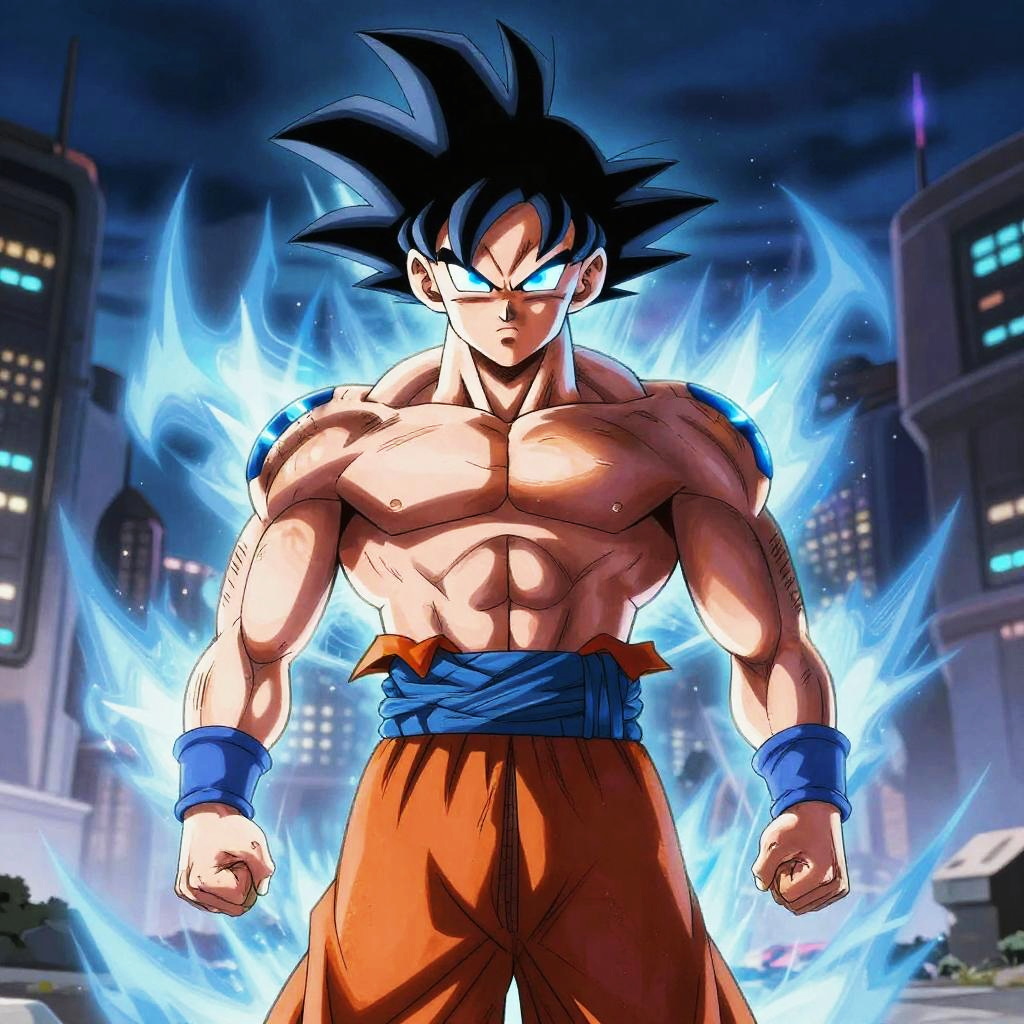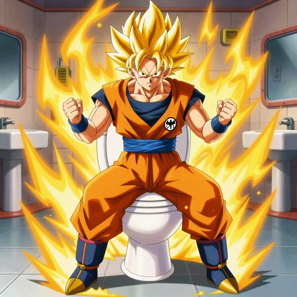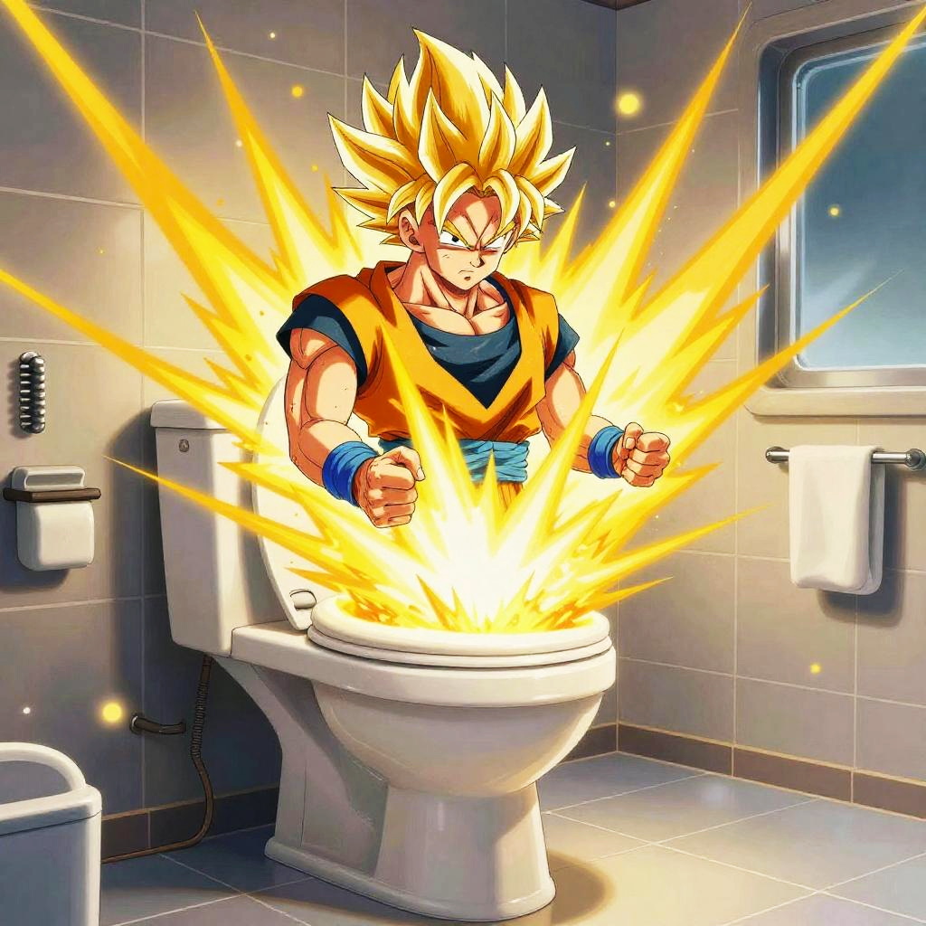 Futuristic bathroom with a Super Saiyan toilet exploding with bright yellow energy, manga inspired, dramatic lighting, high contrast, surreal and humorous scene