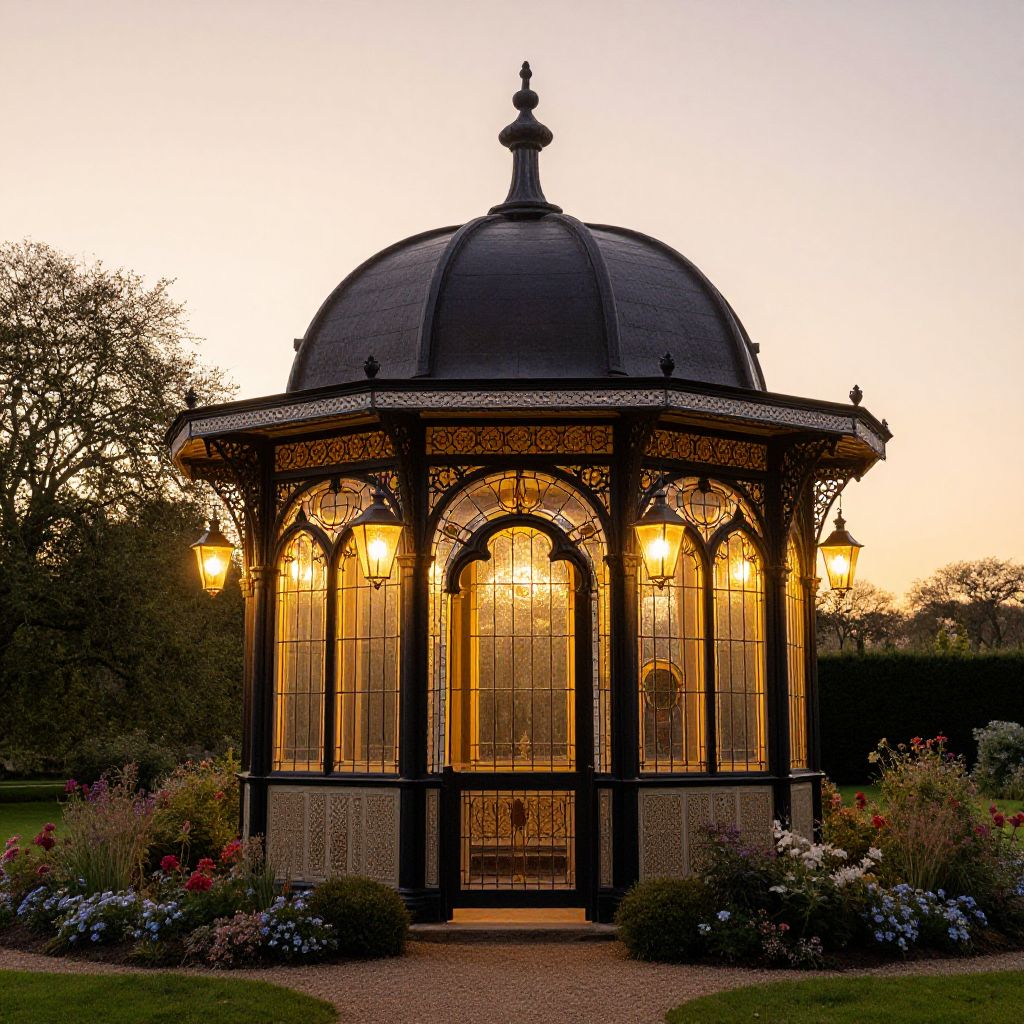 An elegant Victorian-style pavilion in an English country estate, ornate ironwork and stained glass windows, colorful flowerbeds surrounding the structure, vintage lanterns casting warm light during a golden sunset, romantic and nostalgic mood.