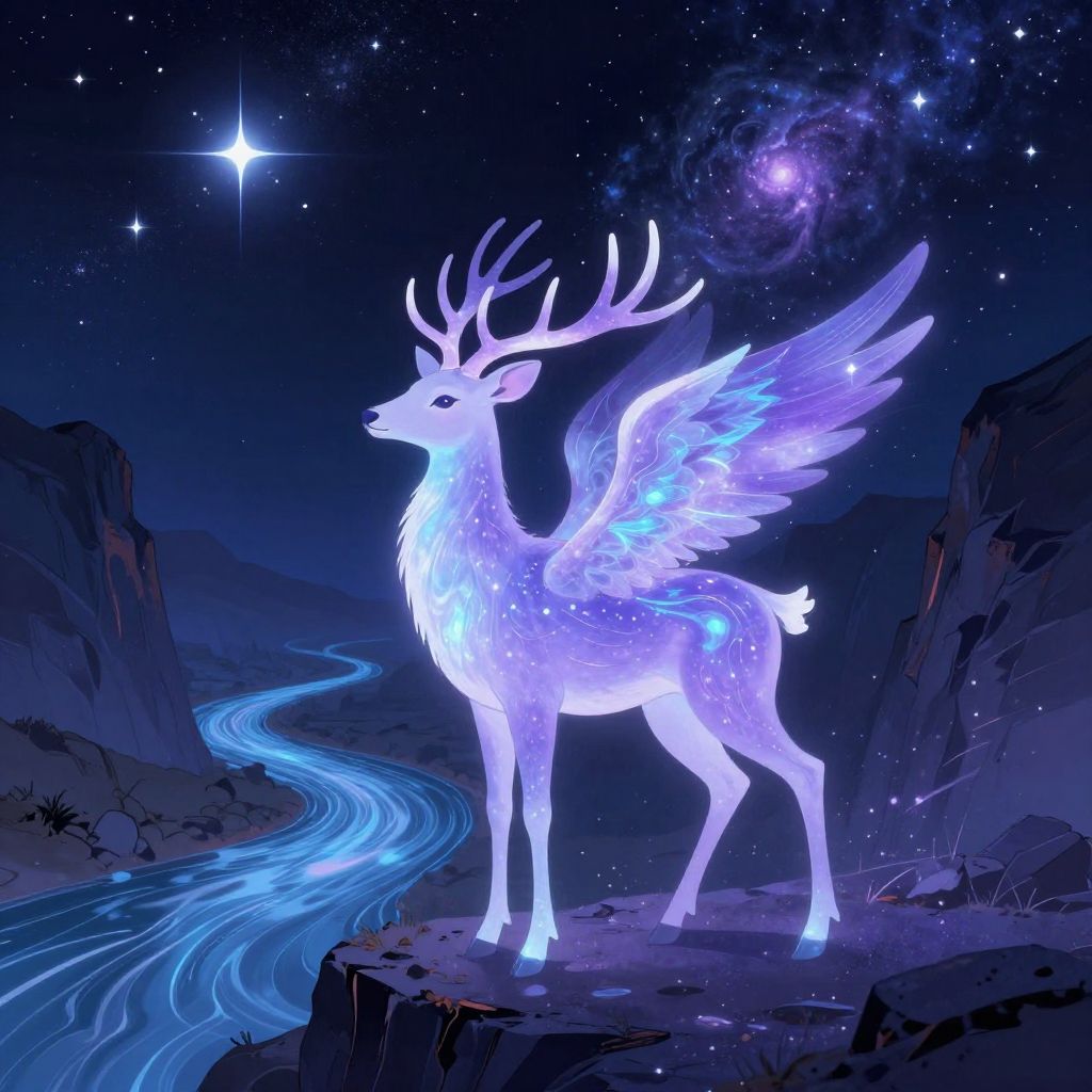 Glowing, ethereal, white deer with wings stands on a cliff by a blue, winding stream under a starry, galaxy-filled night sky