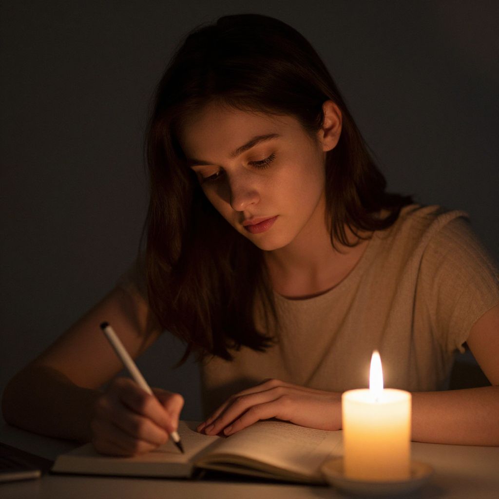 Photograph of a focused young woman with long brown hair, wearing a beige top, writing in a notebook by soft candlelight.