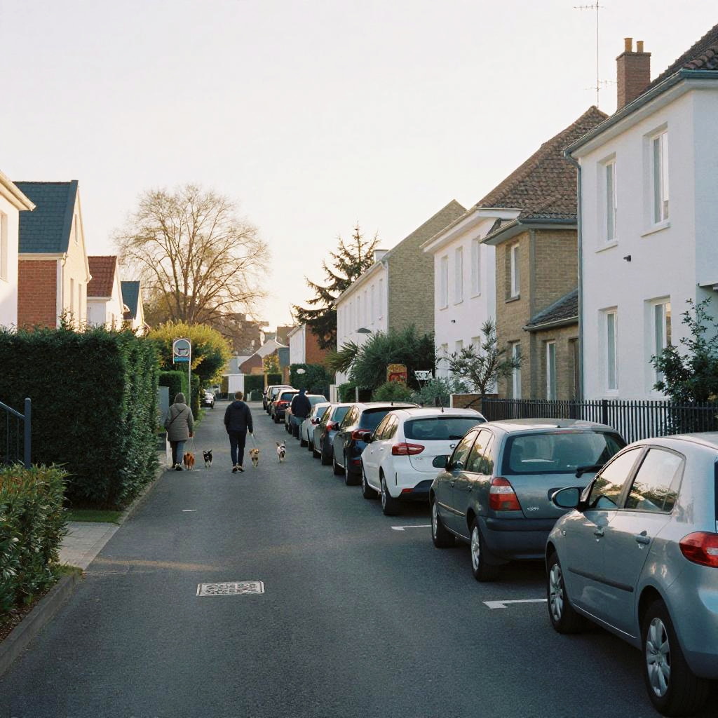 Morning in a European suburb, narrow streets with parked cars, neat hedges, locals walking dogs, historic facades blending with modern touches, gentle sunlight casting long shadows, serene and inviting