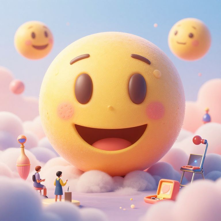CGI image of a giant, smiling yellow emoji with pink cheeks, surrounded by fluffy clouds and smaller smiling emojis. Tiny characters interact with toys on a
