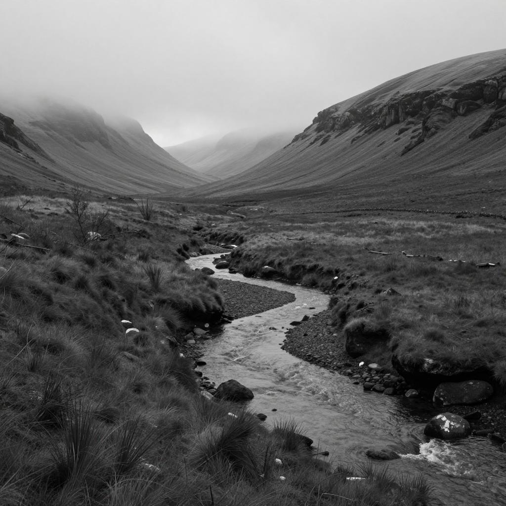 Black and white photograph of a mist-covered valley featuring smooth hills and a winding water channel in the foreground. The stream reflects light as it meanders through grassy terrain with rough textures and scattered rocks. The scene is tranquil and moody with layers of hills fading into fog in the background, emphasizing natural patterns and atmospheric depth.