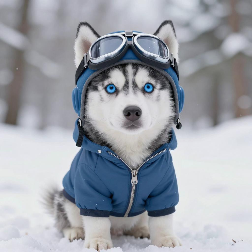 3D rendered portrait of an adorable blue-eyed husky puppy wearing a tiny blue aviator jacket and helmet with goggles. The puppy has a fluffy fur coat and is set against a realistic snowy winter background with soft-focus snow-covered trees. The image showcases a cool muted color scheme and detailed textures, rendered in high resolution with Unreal Engine 5.