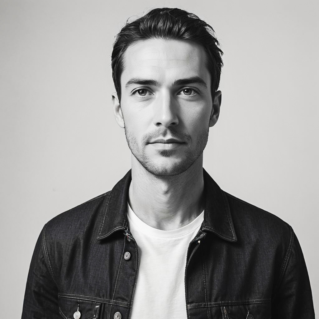 A clean, high-resolution studio portrait of a man, perfectly isolated on a crisp white background. He is dressed in a fitted dark denim jacket over a simple white tee, exuding effortless style and confidence. His contemplative, almost melancholic expression that invites curiosity adds depth to the image, while his casual, relaxed posture with one hand in his pocket and a slight tilt of the head enhances his natural presence. Shot in monochrome black-and-white treatment emphasizing contrast and facial structure, the lighting and composition create a striking yet timeless portrait.