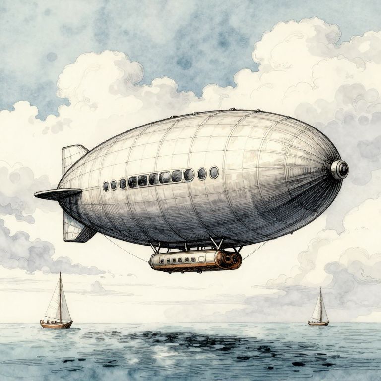 The image depicts a fantastical airship on a cloudy day, rendered in a pen and ink style with watercolor accents. The airship, a large, oval-shaped balloon with a metallic sheen, dominates the scene, floating above the water's surface. Its structure is detailed with various windows and mechanical components, suggesting a complex interior. The airship is tethered by thin lines to the ground, hinting at its ability to descend. In the background, two sailboats are visible, one to the left and another to the right, adding depth to the scene. The sky is filled with fluffy clouds, casting a soft light over the entire composition. The overall arrangement of elements creates a sense of harmony and balance, with the airship as the central focus, surrounded by the serene water and the distant sailboats.