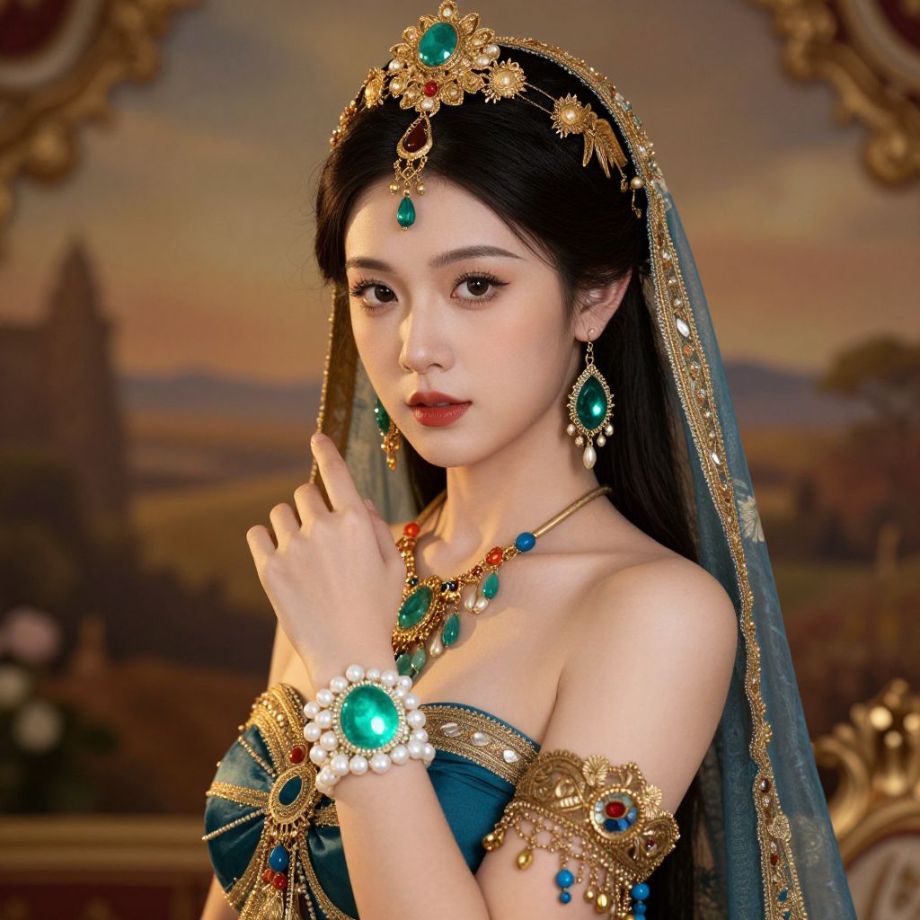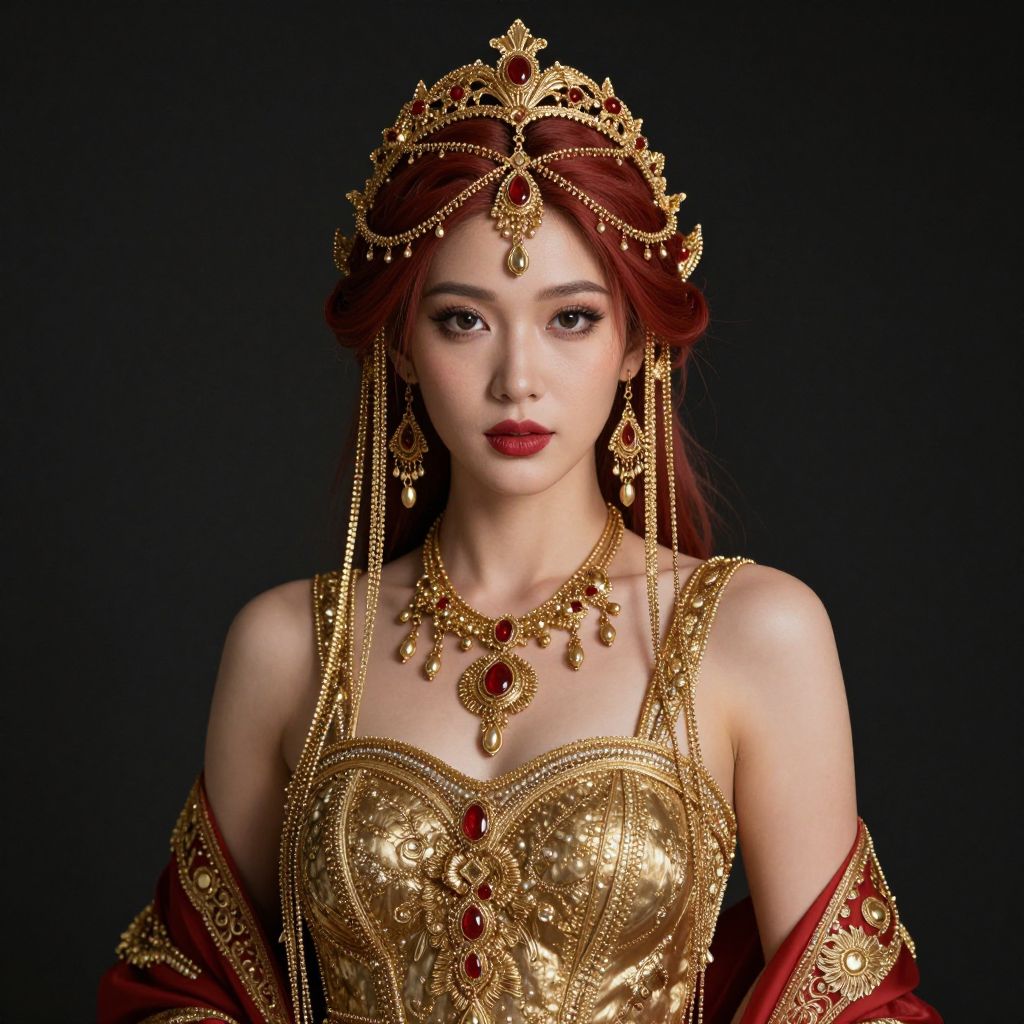 Photograph of an Asian woman with fair skin, red lipstick, and dark hair, wearing elaborate gold and red traditional attire, adorned with intricate jewelry and