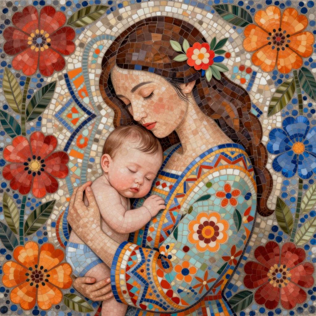 Mosaic illustration of a woman with closed eyes, brown hair, and floral hairpins, cradling a sleeping baby with brown hair. Both wear colorful, patterned garments. Surrounding them are vibrant red, orange, and blue flowers. Background features intricate patterns. Woman's head rests on baby's head.