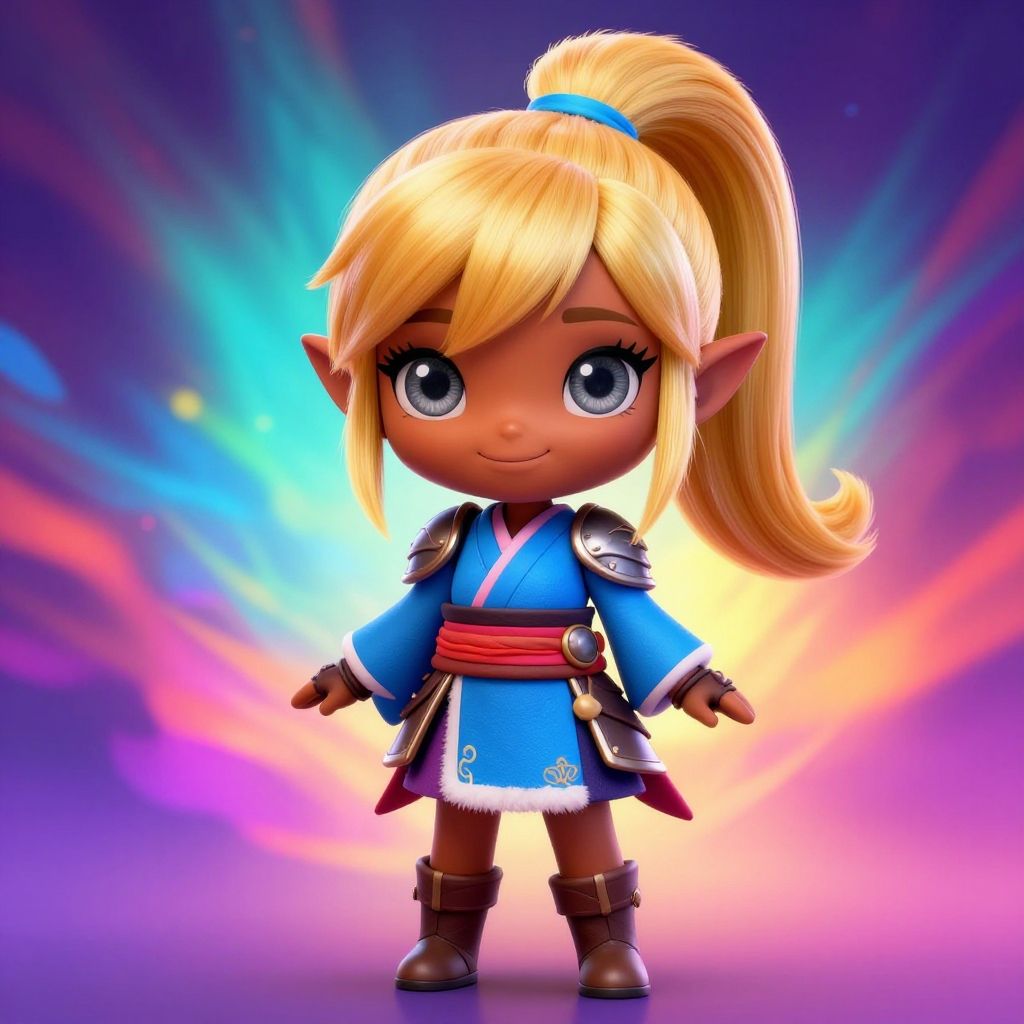 Chloe, 1girl, ponytail, (Deep Gray eyes), kimono, blonde hair, (Covered Body), Ponytail, hairband, (Small), (blue dress, fur trim, armor, fingerless gloves, sash, brown boots), happy smile, brown skin, dark skin, pointy ears, elf ears, ribbon, bangs, (Bodysuit, pauldrons, armor) (masterpiece:1.1)intricate eyes, beautiful detailed eyes, symmetrical eyes, (dark-skinned female:1.2), (glowing eyes:1) cute, adorable, happy, (centered, scale to fit dimensions, Rule of thirds), (ultra detailed, extremely detailed), (photorealistic artwork:1.37), (extremely detailed CG unity 8k wallpaper), (((vibrant colors, vibrant theme))), (intricate), (masterpiece), (best quality), (face Focus)