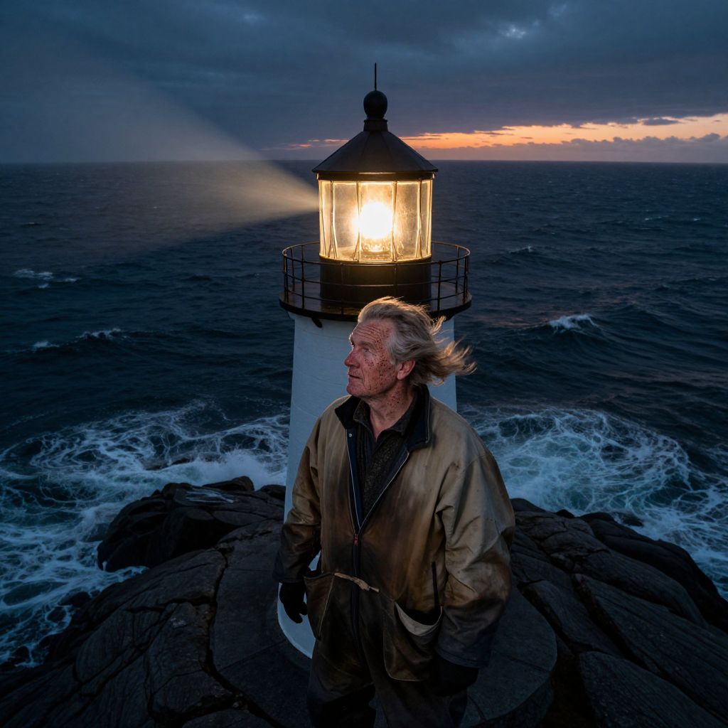 Lighthouse Keeper Amid Stormy Dusk