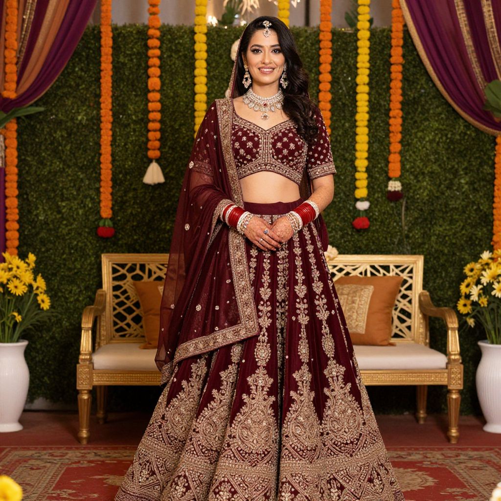 Indian woman in traditional maroon and gold embroidered lehenga, matching dupatta, and jewelry, stands in front of a decorated green wall with yellow and