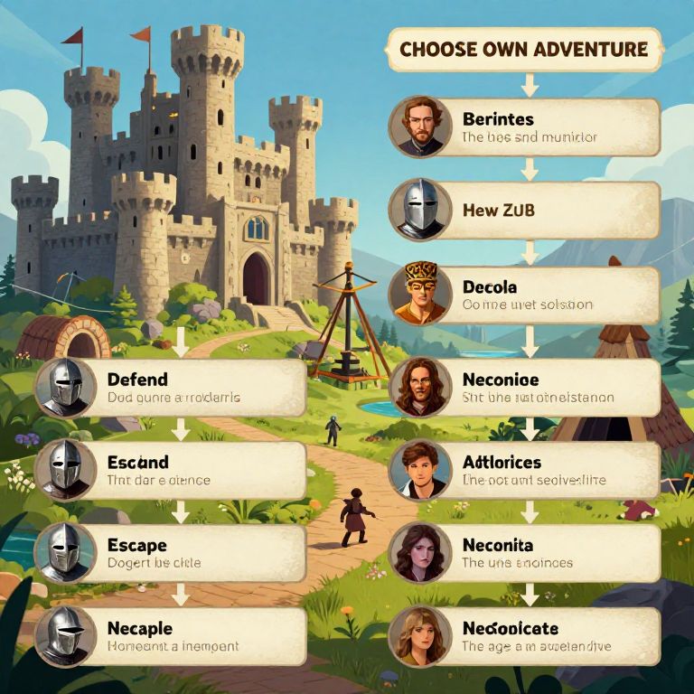 Choose your own adventure prompts depicting a medieval castle under siege, with knights, trebuchets, and secret tunnels, offering multiple story paths where the viewer chooses to defend, escape, or negotiate, illustrated in a dynamic and colorful style.