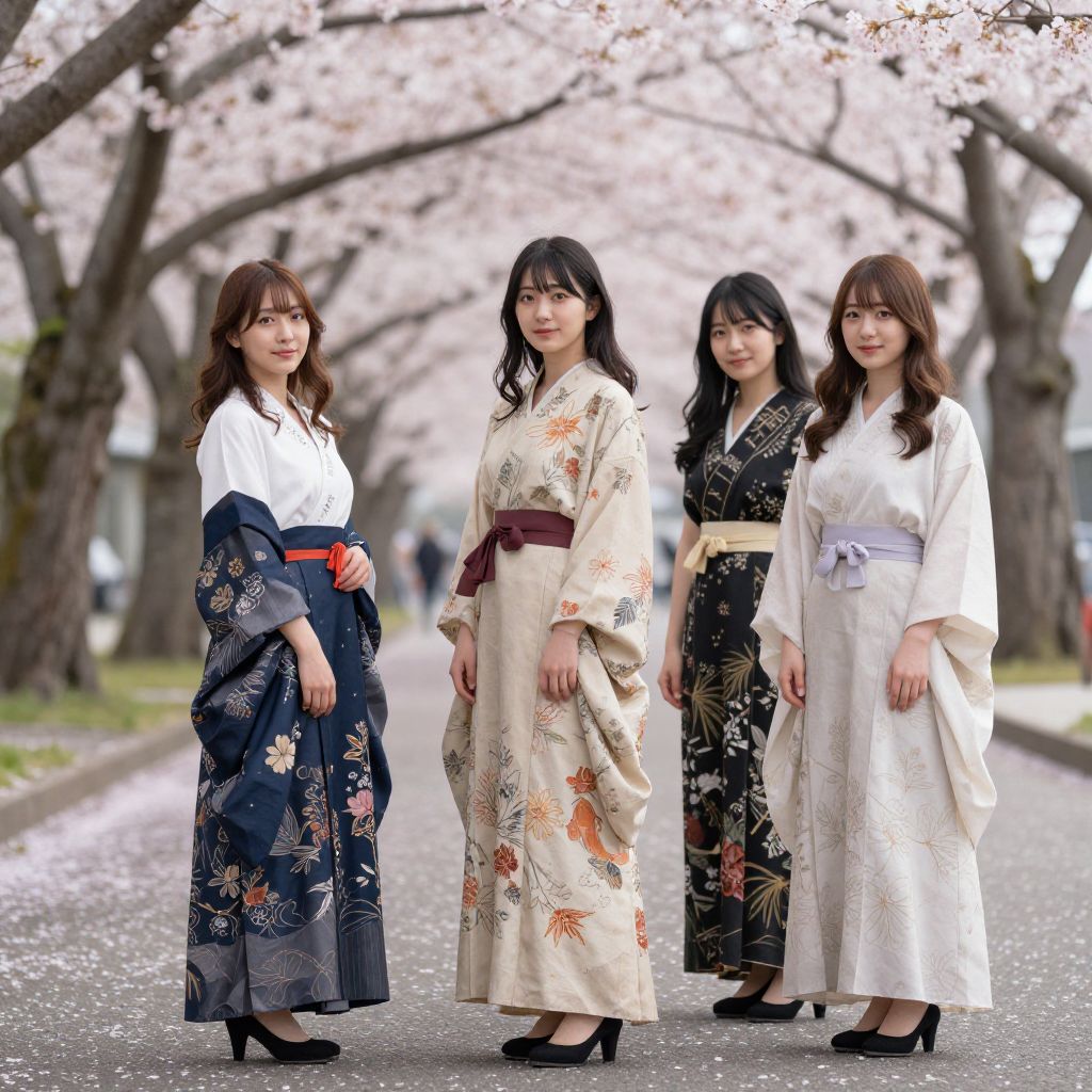 Photograph of four Japanese women in traditional kimonos, standing on a cherry blossom-lined street, wearing black high heels.